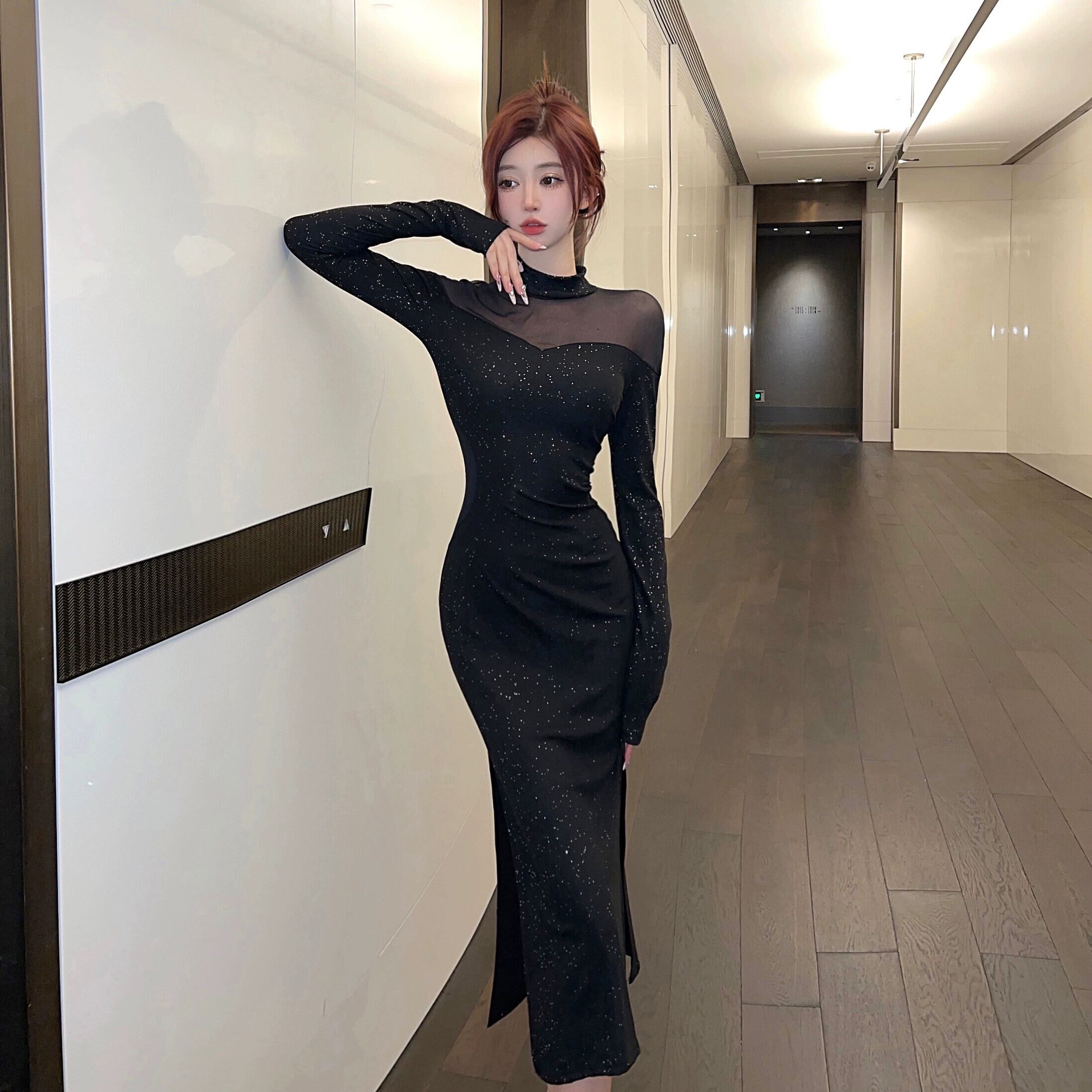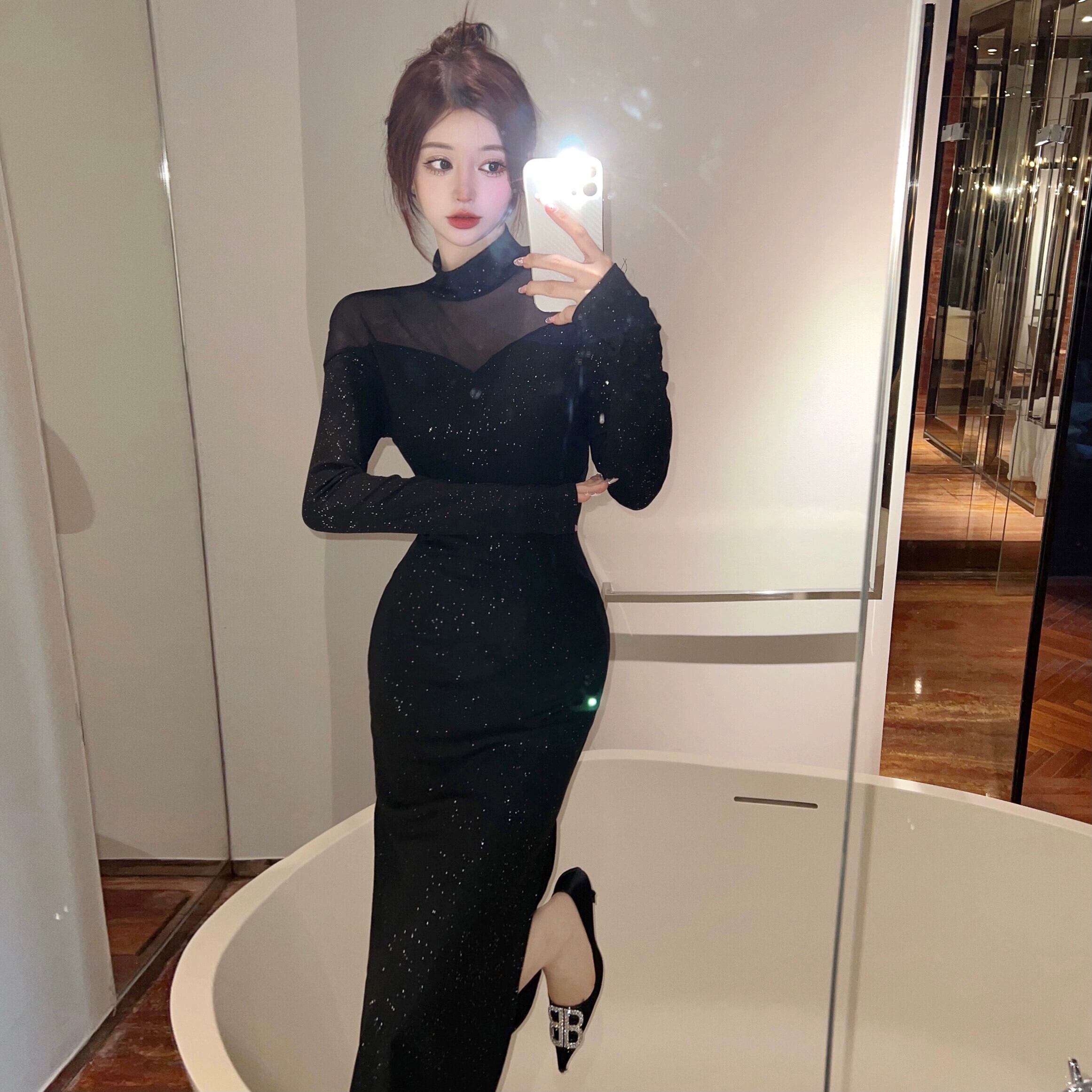 秋の服のハイエンドでエレガントな女性のセクシーなスリットウエストが露出したハイエンドの絶妙な黒の成熟した女性のドレス ブラック オータム 秋物 yingd90548772987
