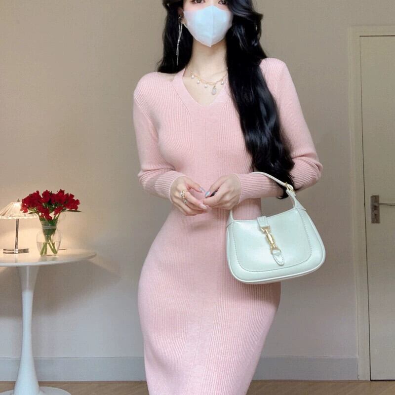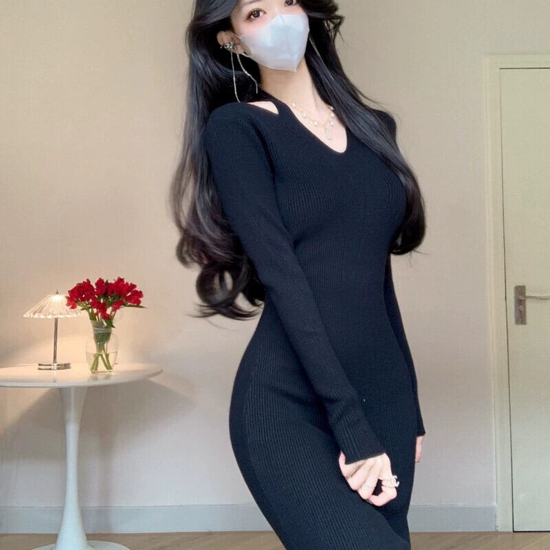 クールでロイヤルシスタースタイルのセクシーなヒップハグスリットセーターロングスカート、スリムフィットでスリムフィット、ドレープのあるミニマリストニットドレス yingd94774336769