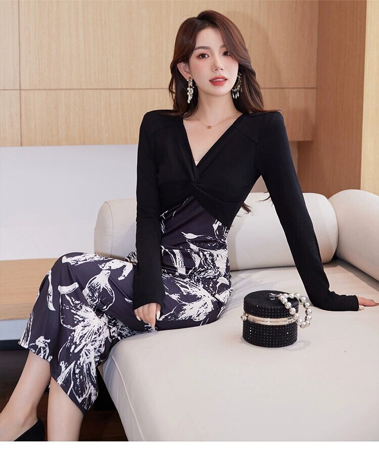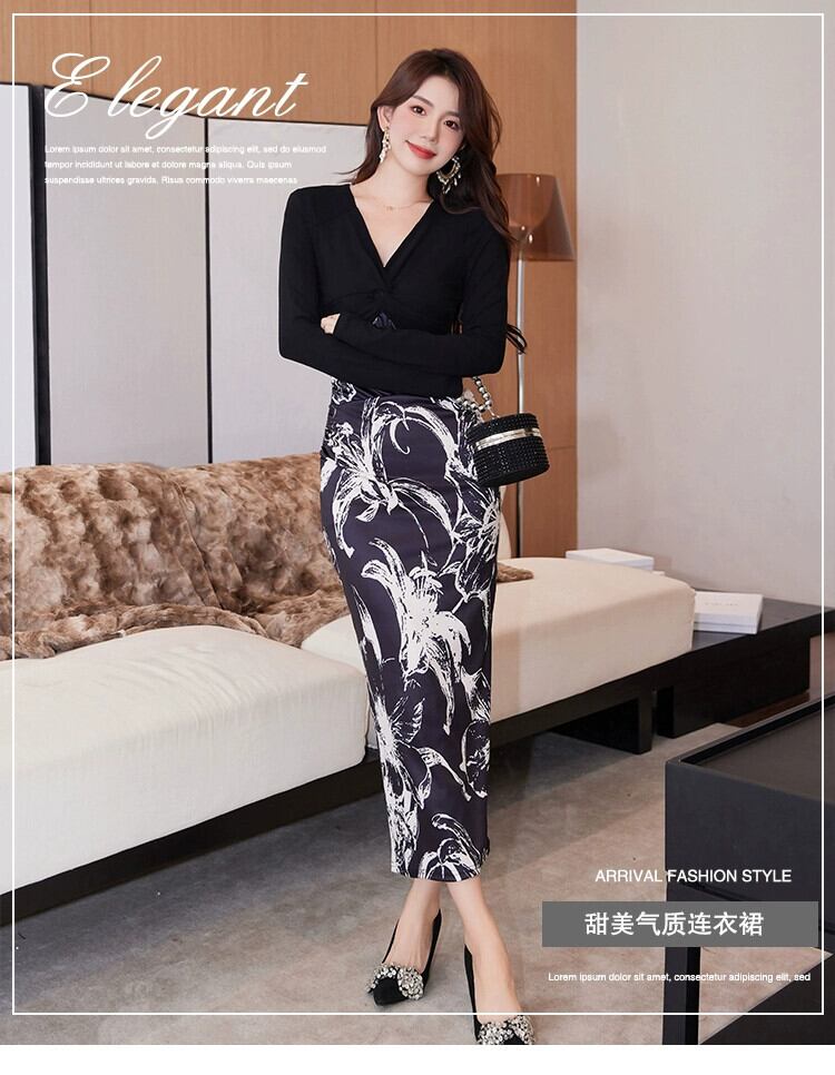 秋の女性の 2024 年の新しいタイトフィットヒップハグ気質社交界のハイエンドの絶妙なプリントブラックドレス、高級感があります オータム 秋物 yingd30449520397