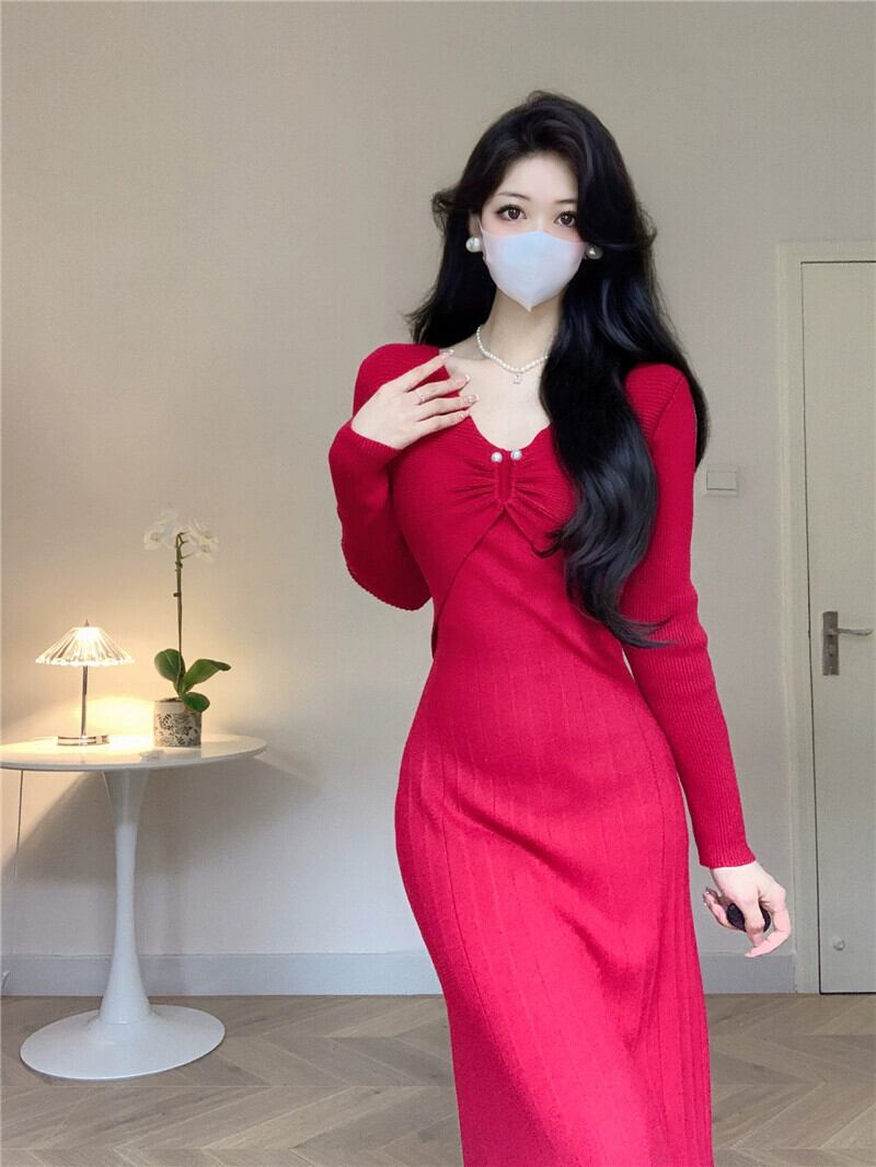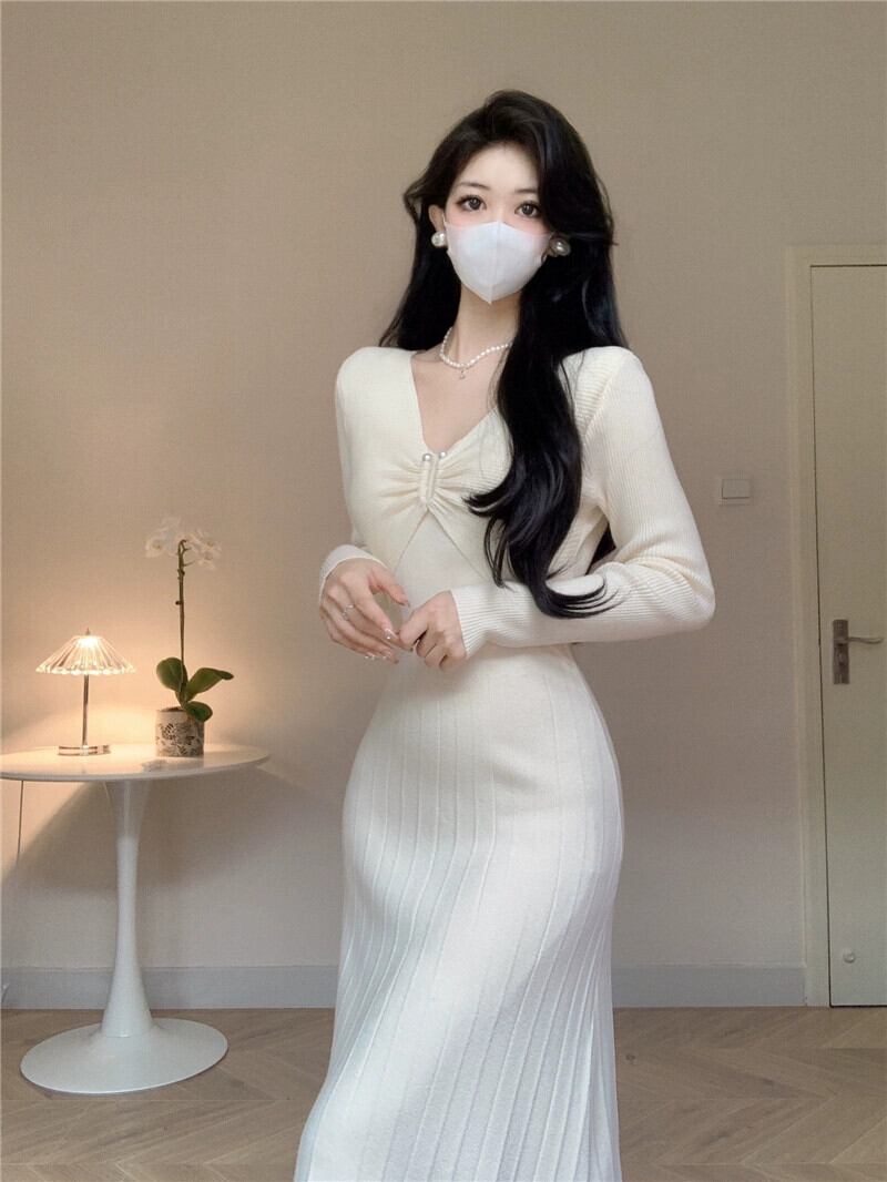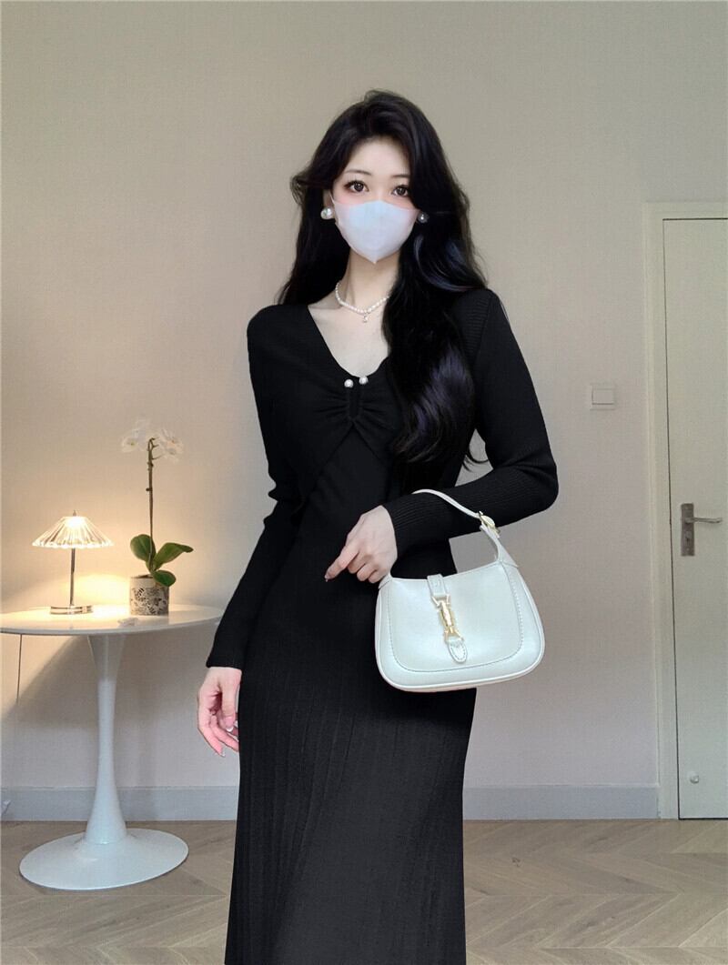 ニットセーターのスカートをコートと一緒に着て、スリムにスリムにします。美しいドレスのティーブレイク、ウエストを絞った秋冬のフレンチロングスカート。 オータム 秋物 ウィンター 冬物 yingd59118051561