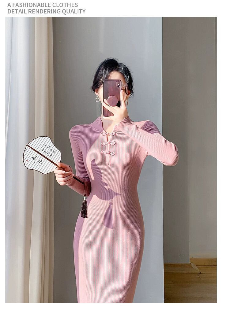 中国風の婦人服 2024 新スタイル痩身気質セクシーなヒップカバー長袖インナーニットディスクボタンドレス ロング yingd65310046157
