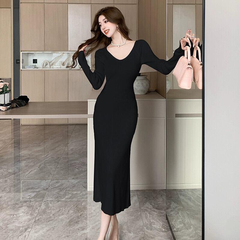 気質婦人服、ハイエンド、超見栄えの良い、ウエストを締めるインナーレイヤリングスカート、秋と冬のVネック長袖ニットドレスレディース ロング オータム 秋物 ウィンター 冬物 yingd8384444267