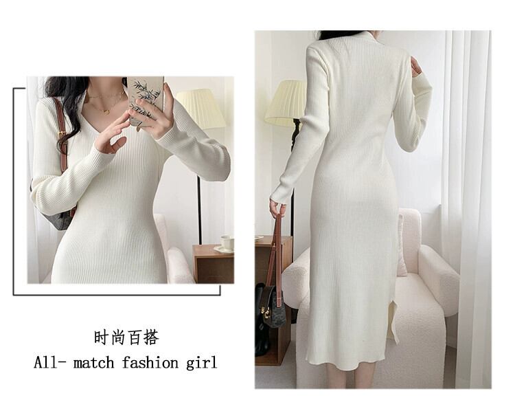 秋と冬には、コートの下に膝上の長いセータードレスを合わせたり、女性の下に高級で非常に見栄えの良いVネックのニットドレスを合わせたりしてください。 ロング オータム 秋物 ウィンター 冬物 yingd22470715705
