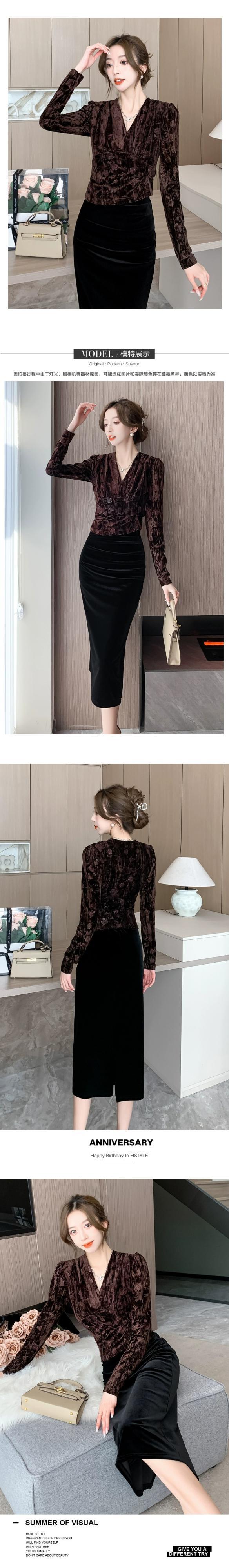 シックで個性的で美しいボトムスシャツ、Vネック長袖ベルベットトップス、スリットスカート、冬用スカートスーツ、2点セットレディース ロング ウィンター 冬物 yingd58522930674
