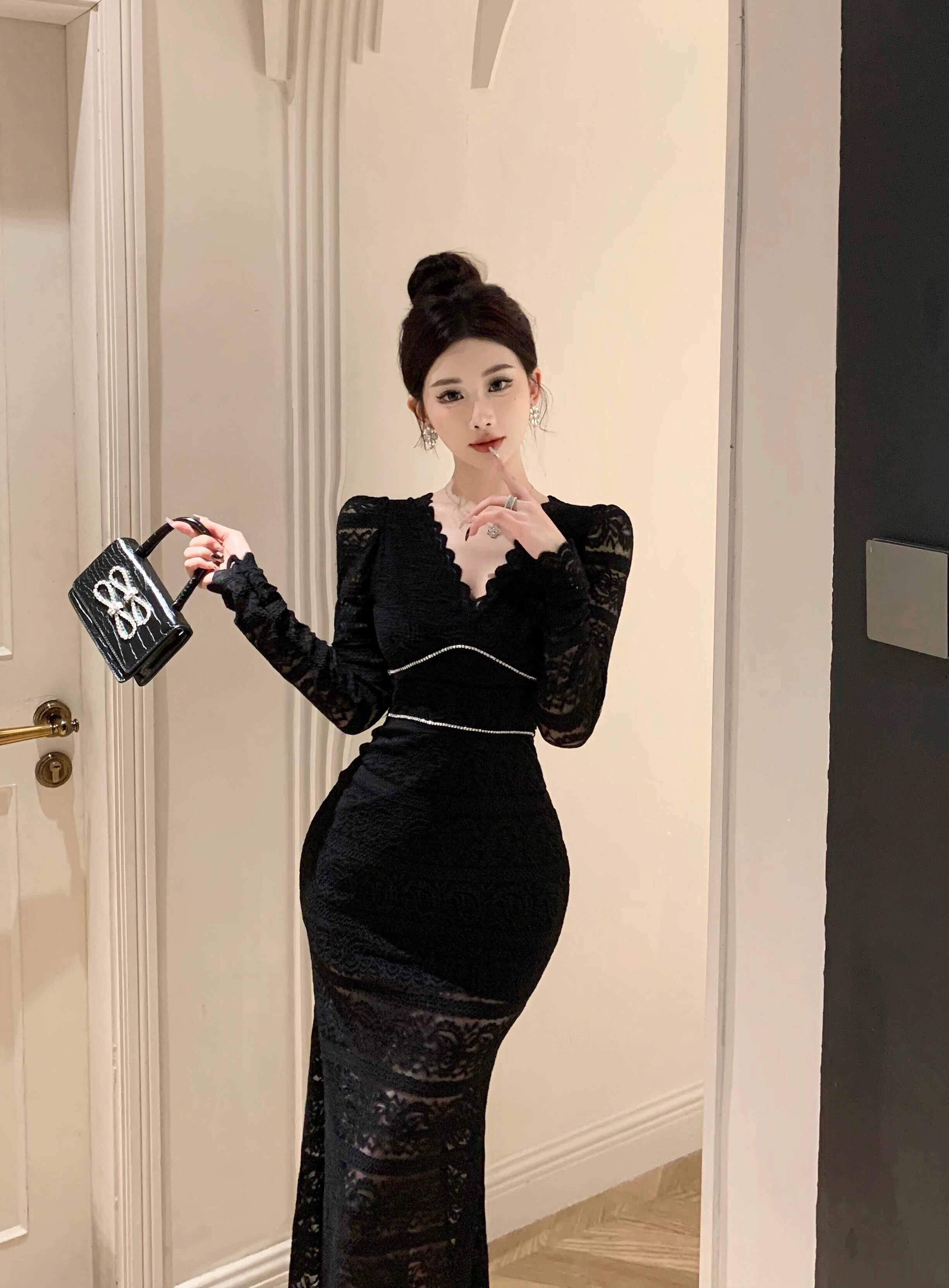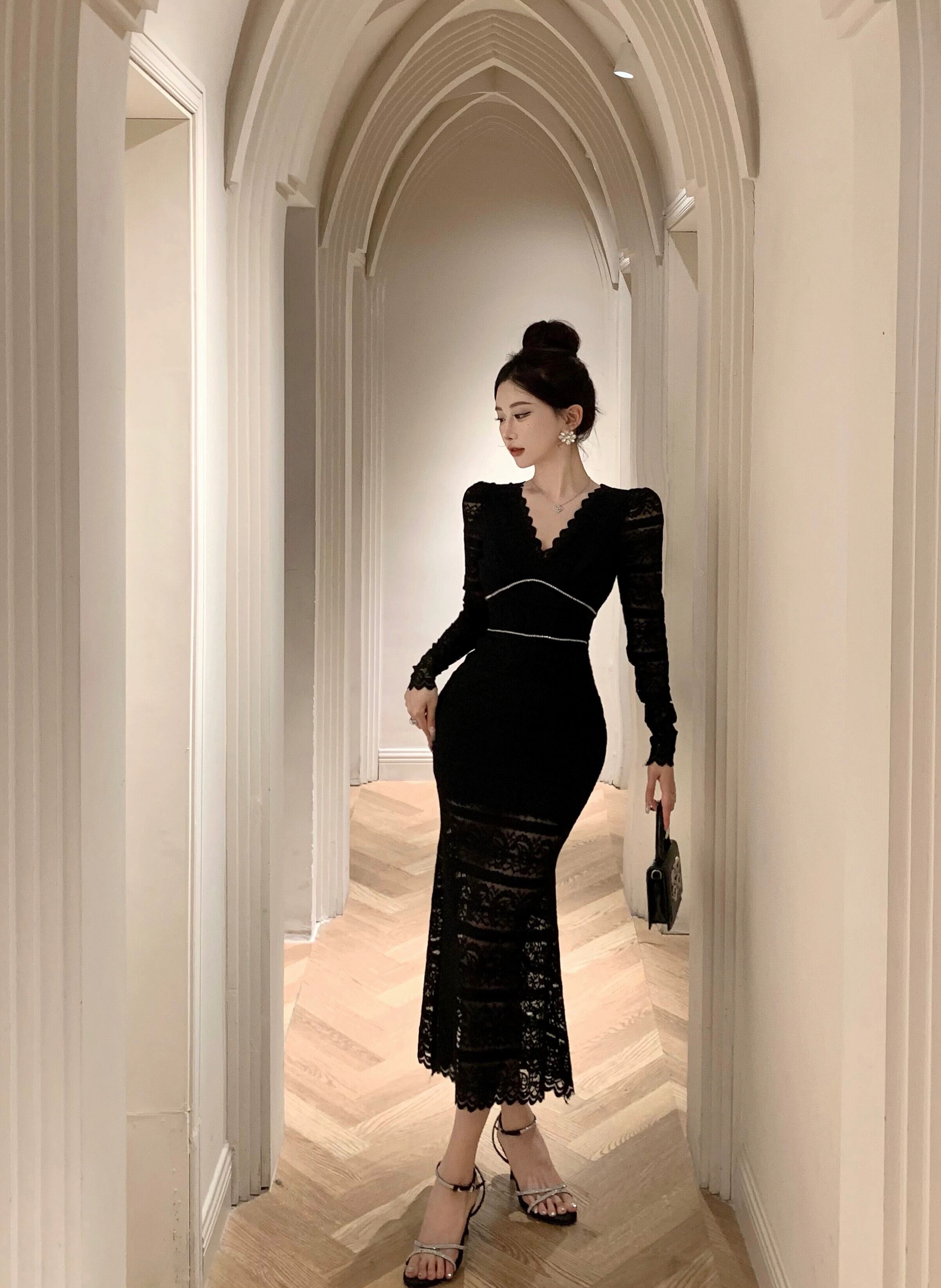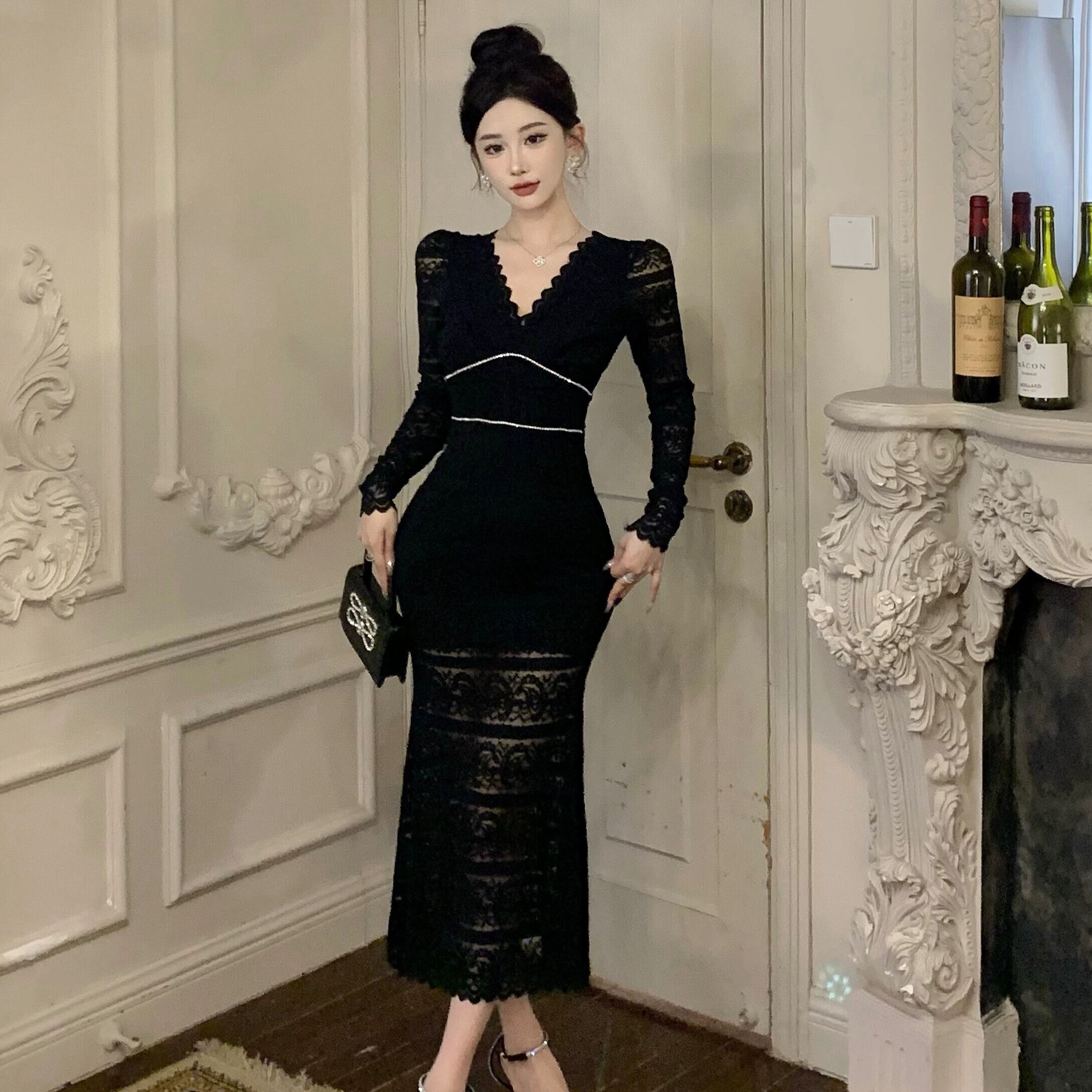 Bubu Shenglian フィッシュテールスカート秋冬-コールドロイヤルシスタースタイルレース V ネックドレス 2023 女性の秋冬プレミアム オータム 秋物 ウィンター 冬物 Vネック yingd58013031897