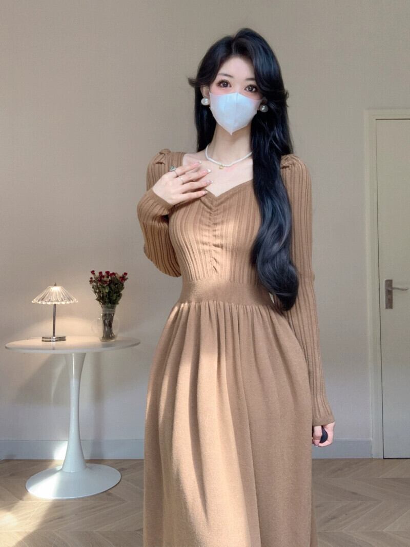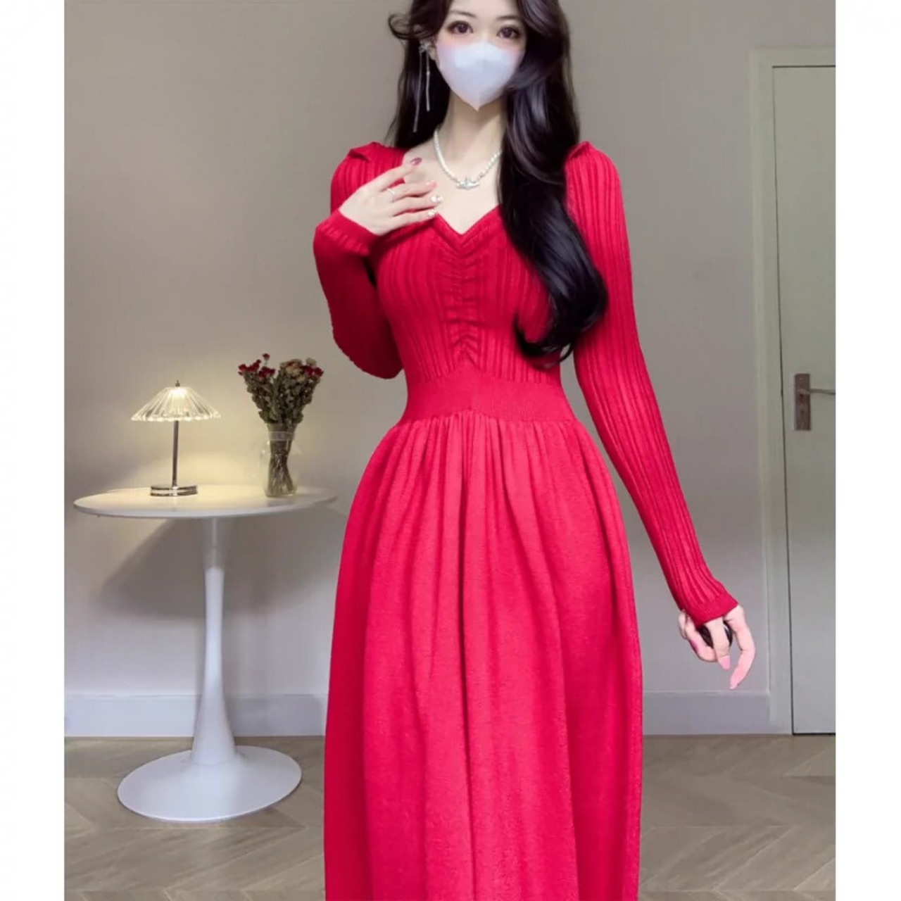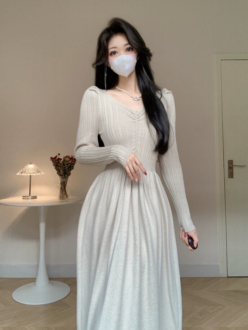 秋冬のロング膝上セータードレス、スリムウエストとスリムなインナースカート、長袖Vネックニットドレス オータム 秋物 ウィンター 冬物 yingd86979475950