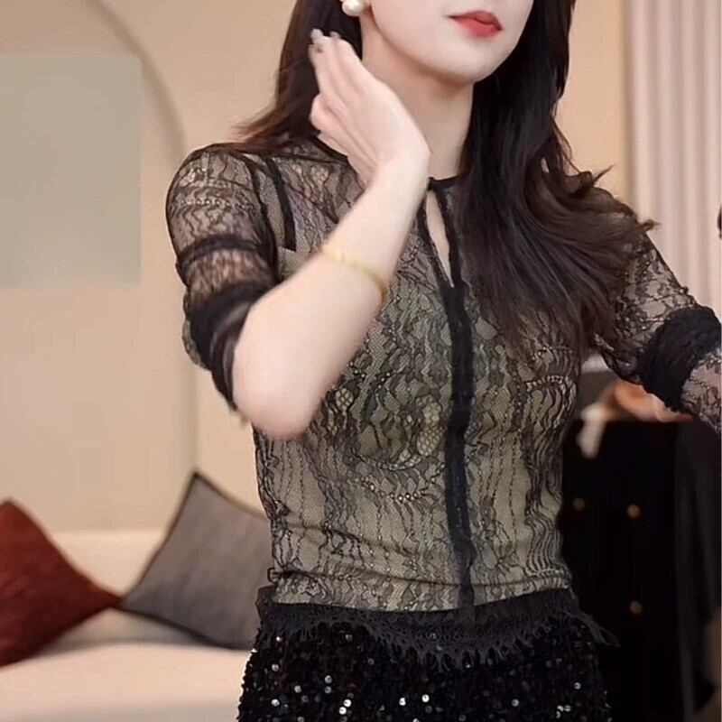 レース底シャツ女性 2024 新しい秋と冬のインナーウェア痩身デザイン中空長袖 Tシャツトップ女性 ロング オータム 秋物 ウィンター 冬物 yingd75900383626