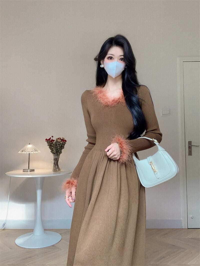 コート付き膝上ロングセータードレス、高級ファースプライシングニット冬のインナードレス、女性用ベーススカート ウィンター 冬物 yingd7176550771