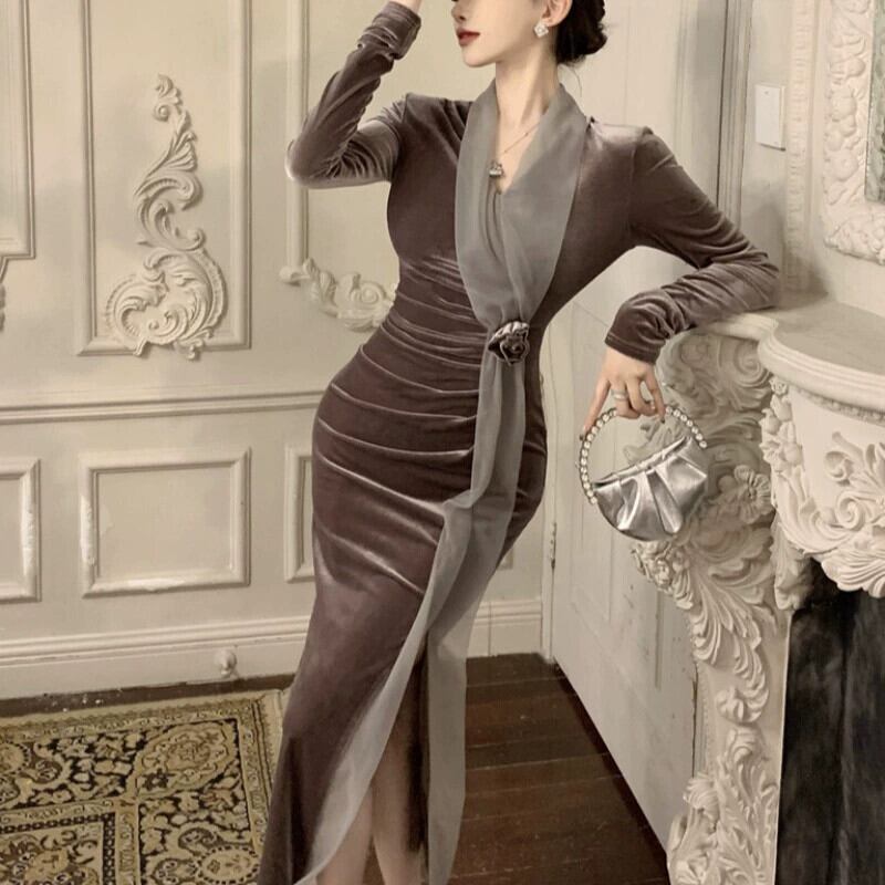 シックで美しいミニスカート、メッシュスプライシング、ベルベットウエスト、スリムフィット、ヒップハグスリット、冬用インナードレス、高級感 ウィンター 冬物 yingd39852229324