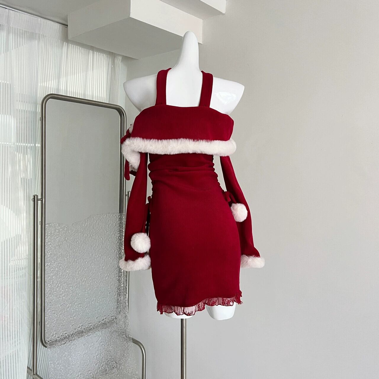 雰囲気のあるクリスマスウェア、切りっぱなしのエッジの赤いシャツ、スリムフィット、ヒップを包み込む長袖ホルターネックドレスの女性の秋と冬 ロング レッド オータム 秋物 ウィンター 冬物 yingd44453927711