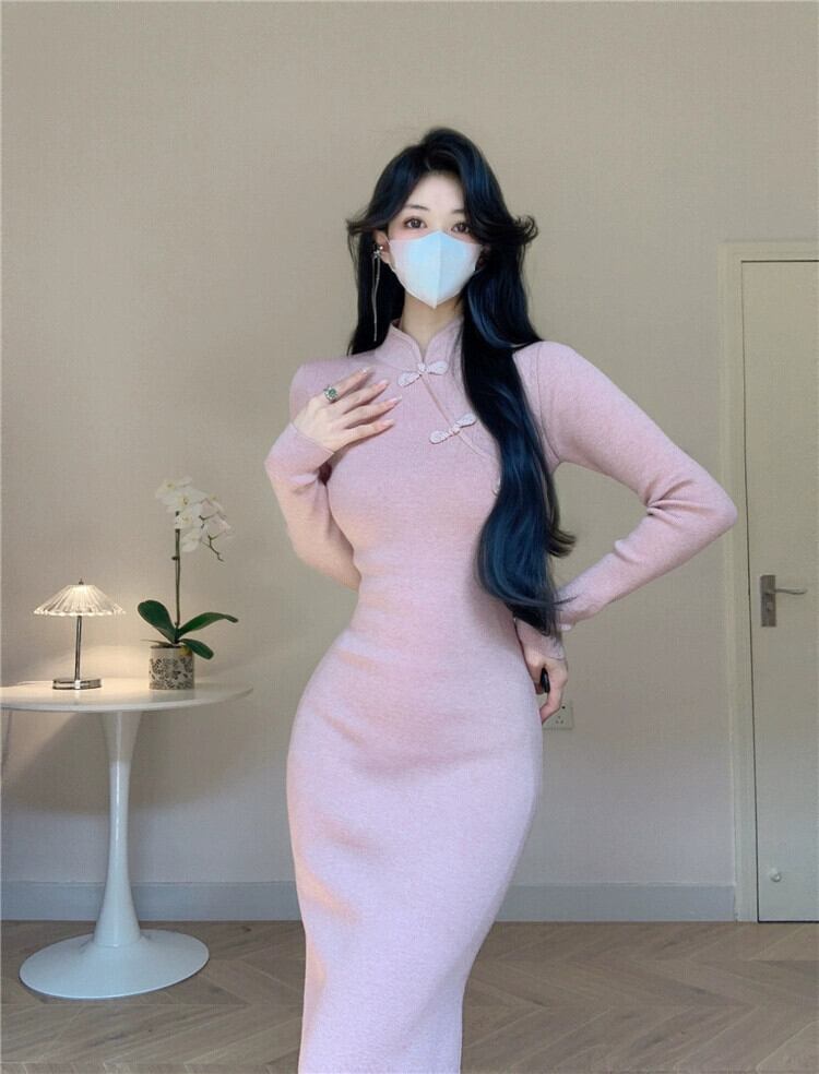 中国風のレトロな国民風のセータードレススリムフィットヒップカバー改良されたチャイナドレスニット冬のインナードレス女性 ウィンター 冬物 yingd18772713070