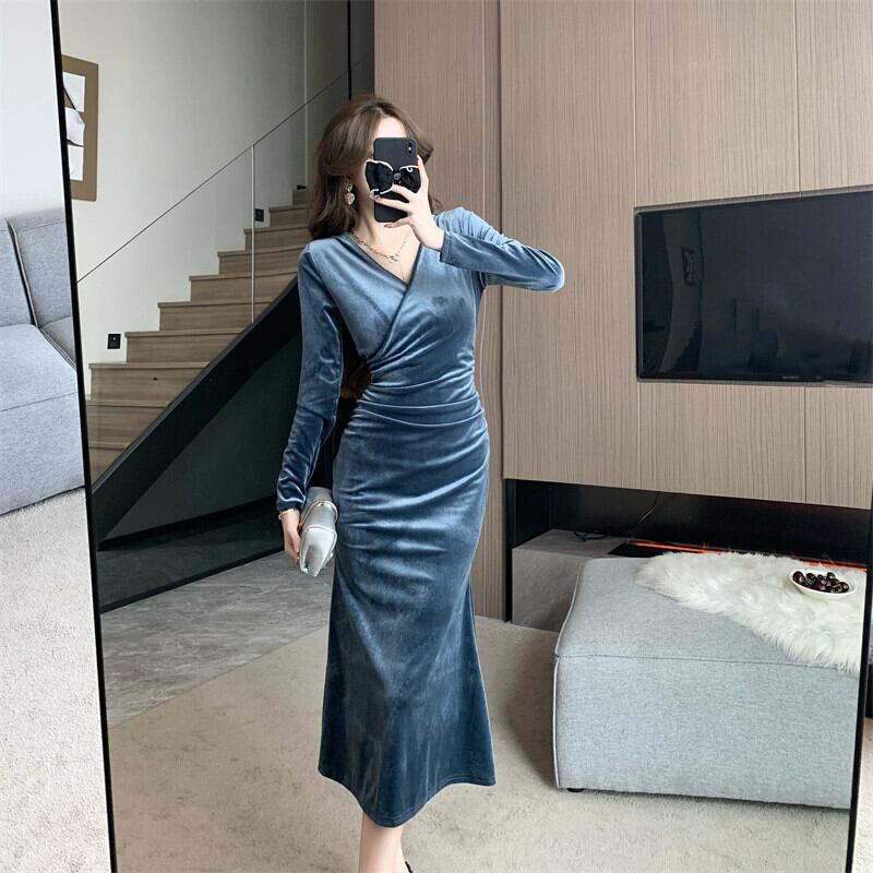 Bubu Shenglian フィッシュテールスカート、フェミニン V ネックベルベットヒップカバードレス 2024 レディース秋冬プレミアム オータム 秋物 ウィンター 冬物 Vネック yingd40068826344