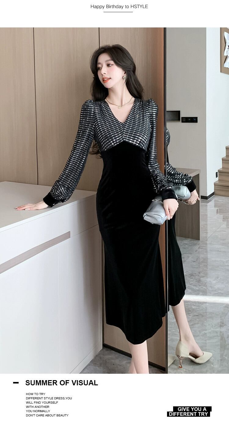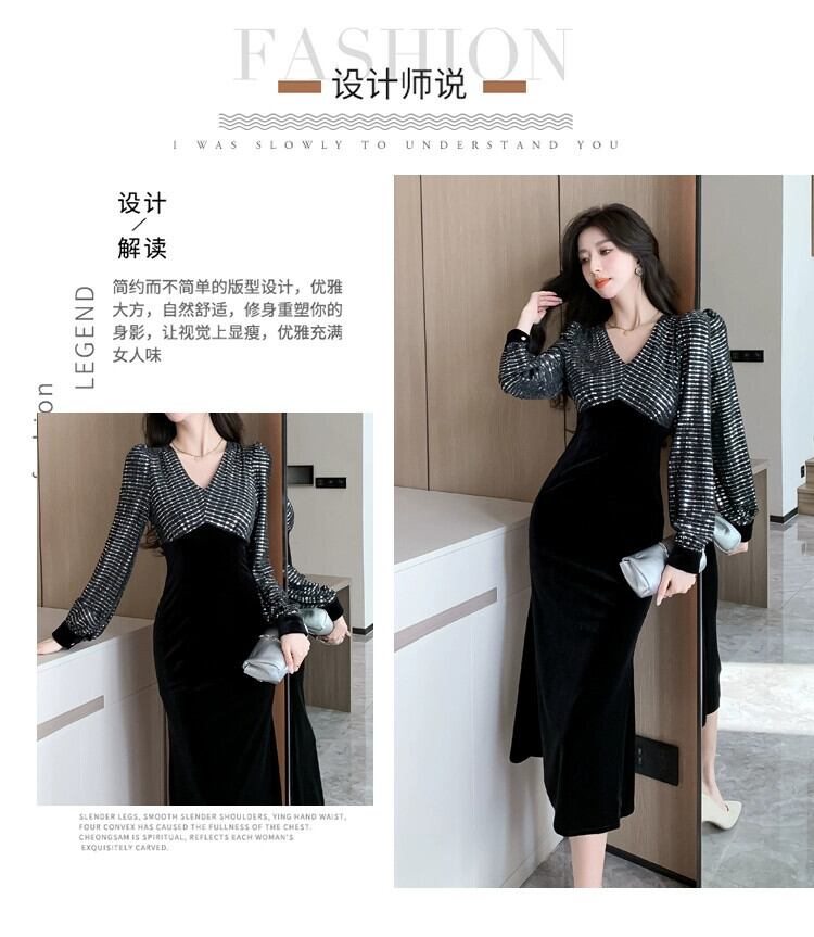 シックで美しい小さなマザーズスカート、ウエストスリム、フェミニン、ハイエンドVネックスパンコールベルベットドレス秋冬 オータム 秋物 ウィンター 冬物 yingd57332177446