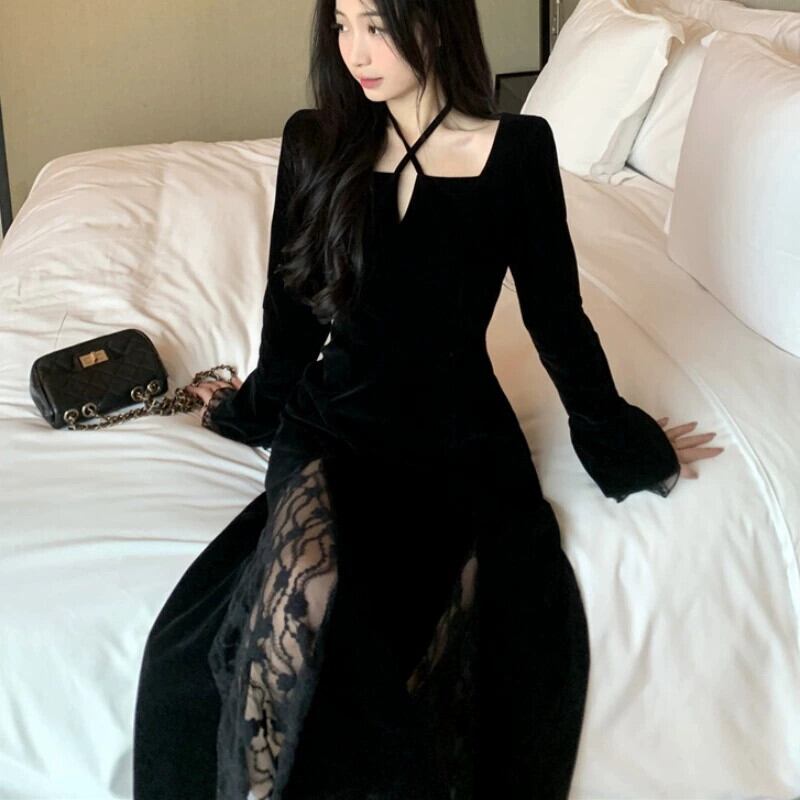 プラスサイズの婦人服太mm、シックで美しいデザイン、スリットレーススプライシングベルベット、ハイエンドのホルターネックドレス女性 大きめサイズ yingd11122998912