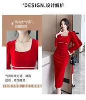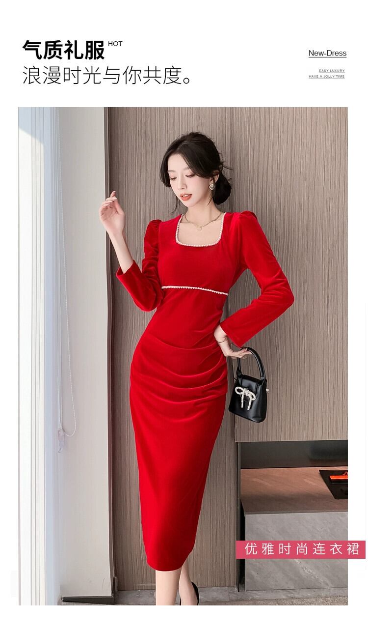 赤い中国の年の女性のハイエンドウエスト痩身長袖スクエアネックビーズベルベットドレス秋と冬の女性 ロング レッド オータム 秋物 ウィンター 冬物 スクウェア yingd94630123371