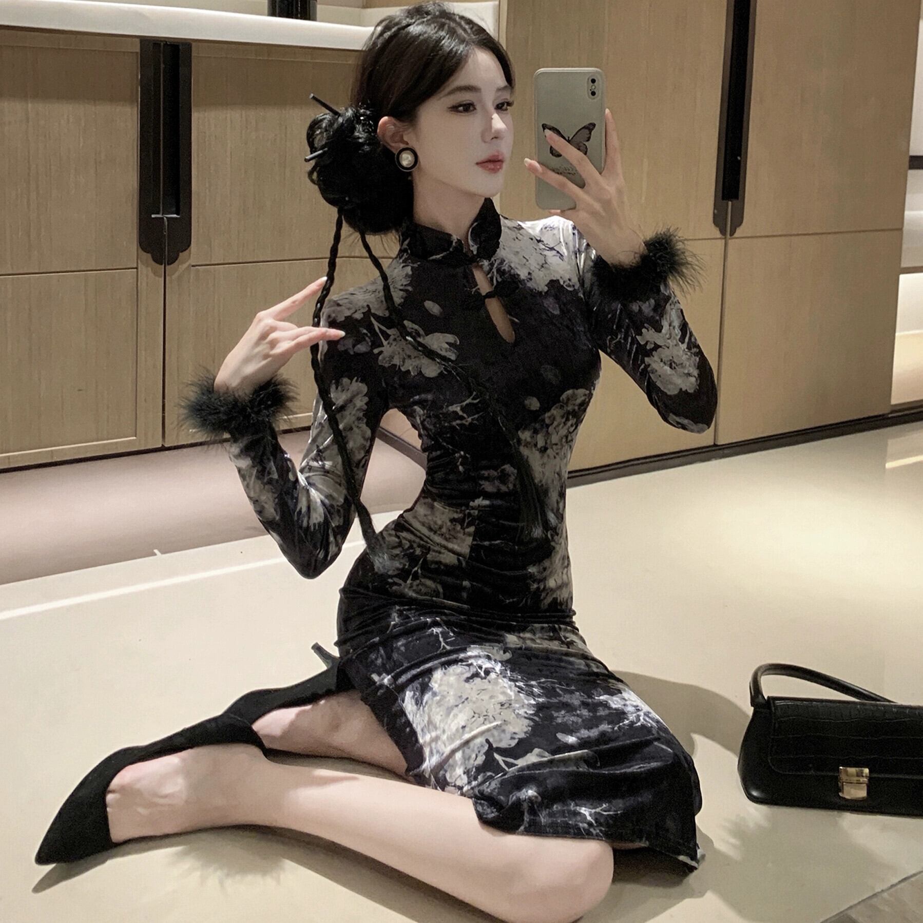 さまざまなスタイルの中国風の女性の秋冬スタイルのスカート、高級ベルベットプリントの改良されたチャイナドレス女性 オータム 秋物 ウィンター 冬物 yingd7785742658