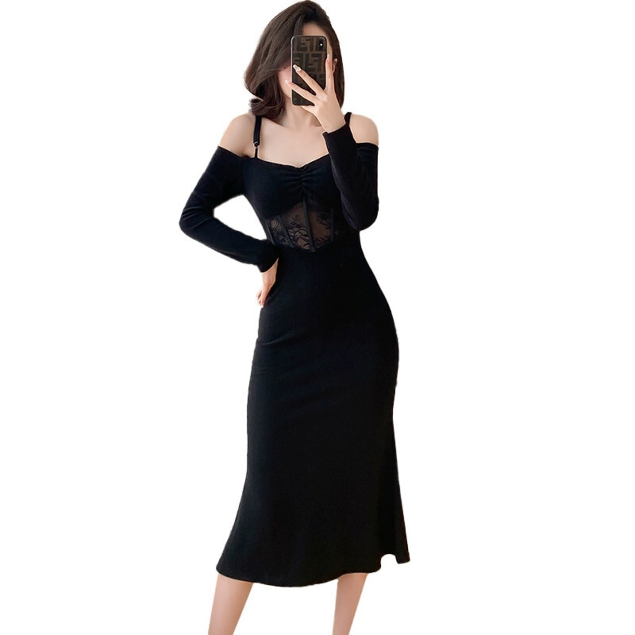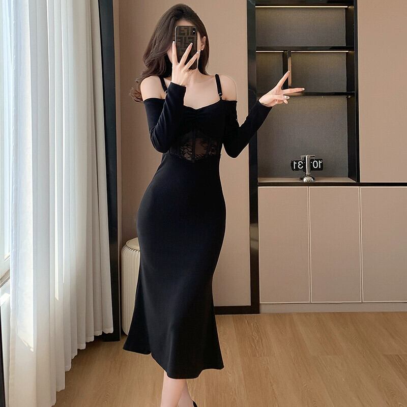 Bubu Shenglian フィッシュテールスカート女性の秋と冬 2024 レーススプライシングニットセクシーなサスペンダードレス女性 オータム 秋物 ウィンター 冬物 yingd3442013183