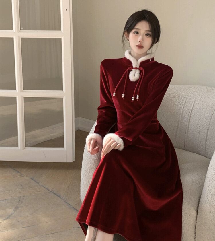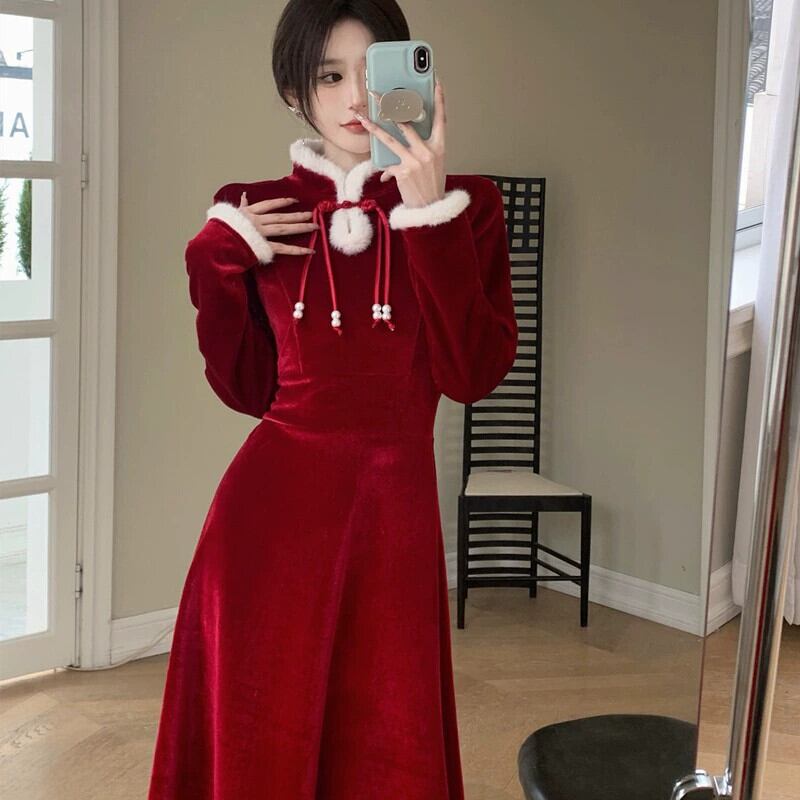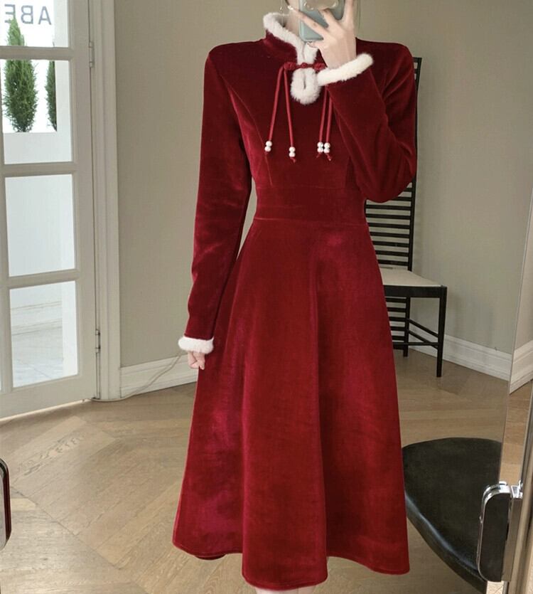中国風の女性の赤い年シャツ、ウエストを細くし、気質のベルベットの冬のインナーウェア、大きいサイズと美しいドレス レッド 大きめサイズ ウィンター 冬物 yingd29517263393