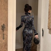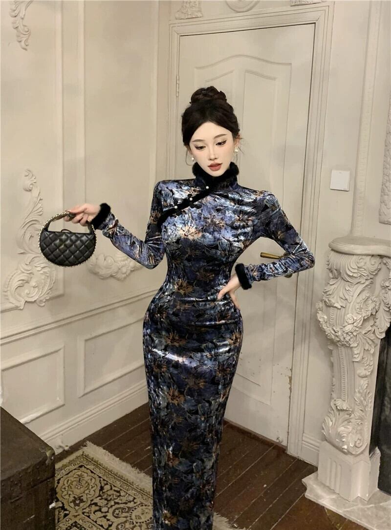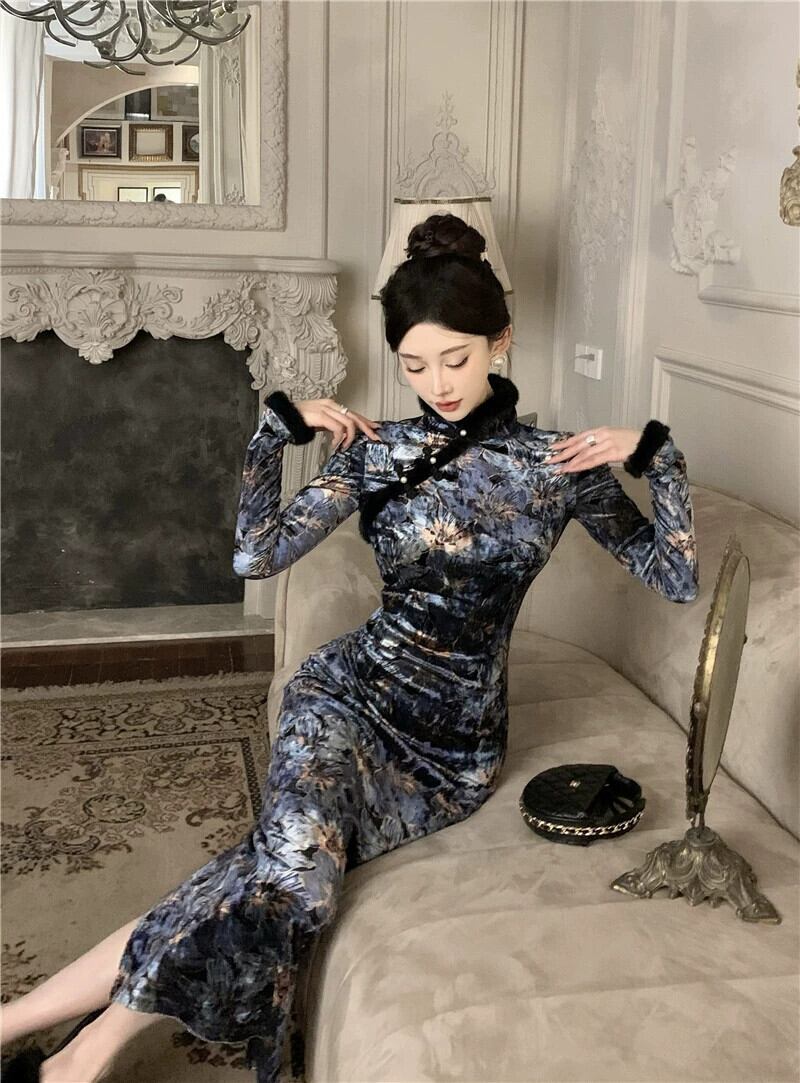 中国風の女性の秋と冬スタイルのレトロな国民風ベルベットプリント改良チャイナドレス毛皮の襟冬のインナードレス オータム 秋物 ウィンター 冬物 yingd41604862424