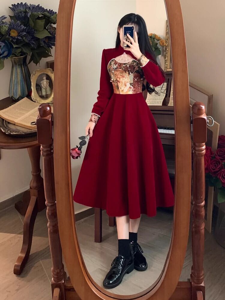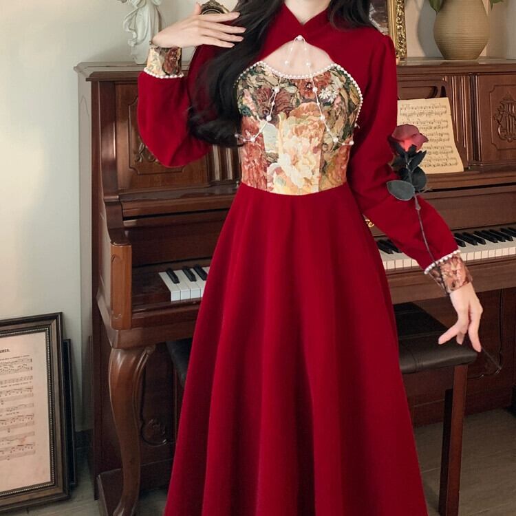 中国風の女性の秋と冬に改良されたチャイナ ドレス ロング スカート、ウエストを細くし、エレガントでハイエンドな大きいサイズと美しいドレス 大きめサイズ オータム 秋物 ウィンター 冬物 yingd24113811050