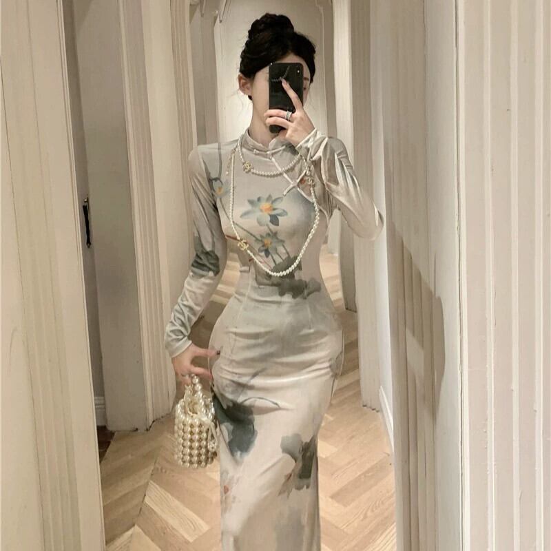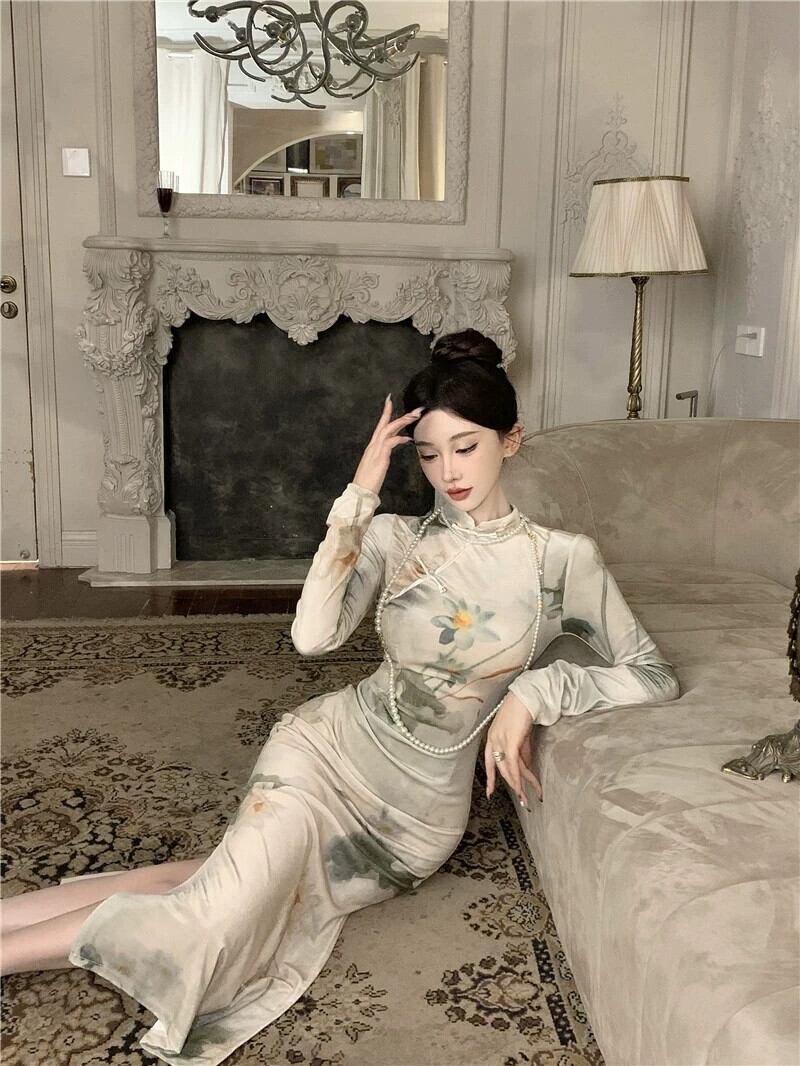 中国風の女性のクールでスリムフィットのヒップハグプリントベルベットの改良されたチャイナドレス女性の秋冬の高級感のある オータム 秋物 ウィンター 冬物 yingd34132497439