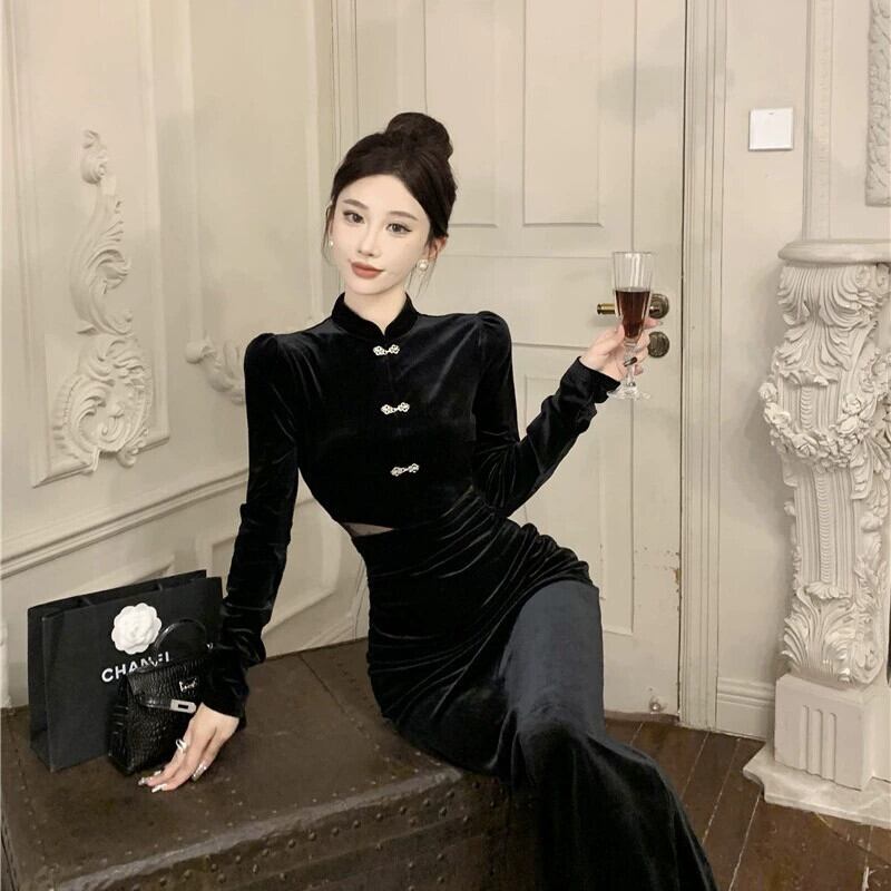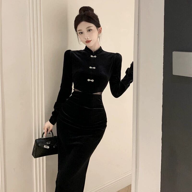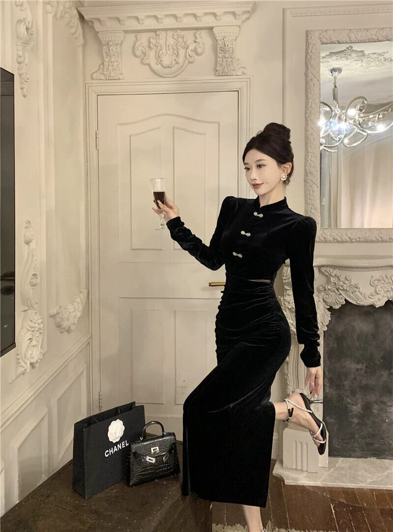 中国風の女性の秋と冬のスタイルのエレガントな女性ベルベットリトルブラックドレス中空レースレトロ改良されたチャイナドレス オータム 秋物 ウィンター 冬物 yingd55010536365