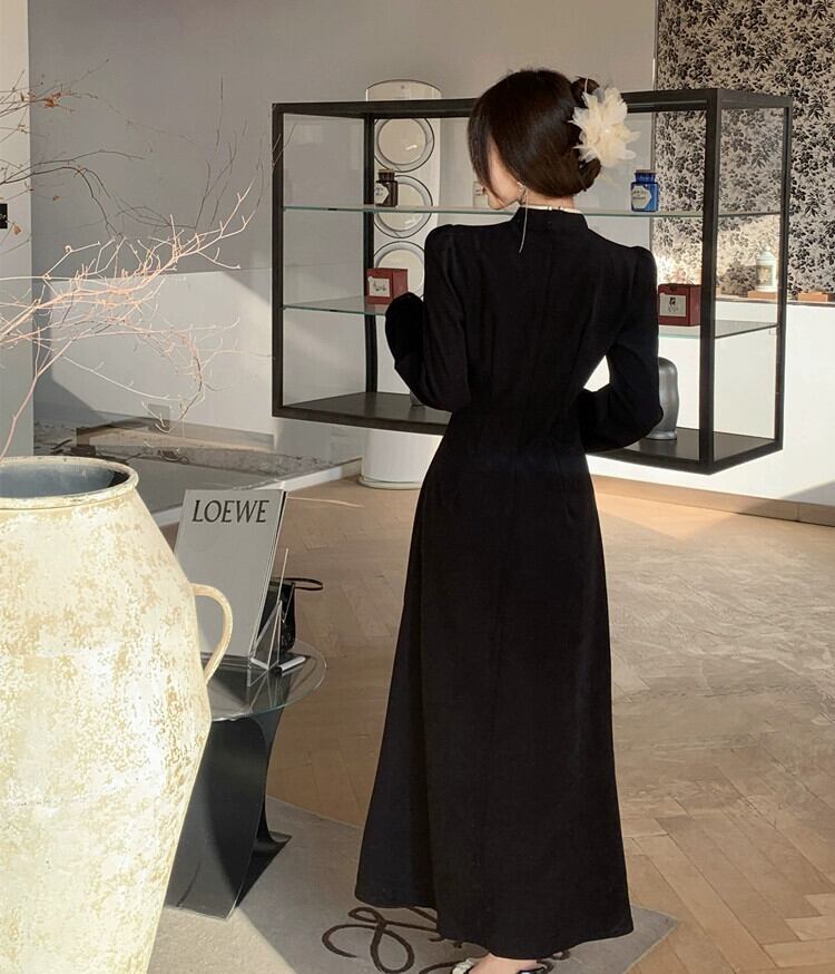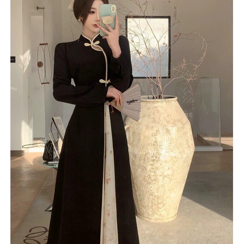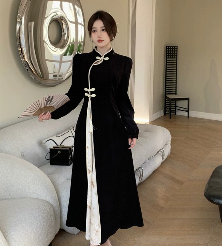 中国風の女性の秋と冬スタイルの水墨画レトロ国民風改良されたチャイナドレスロングスカートウエスト大きいサイズの美しいドレス 大きめサイズ オータム 秋物 ウィンター 冬物 yingd62378240493