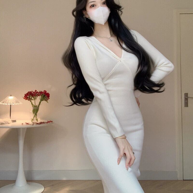 秋と冬のロングニーハイセータードレス女性、ウエストを細くし、コートと底付きニットドレス付きのセクシーなVネック オータム 秋物 ウィンター 冬物 yingd51796349093