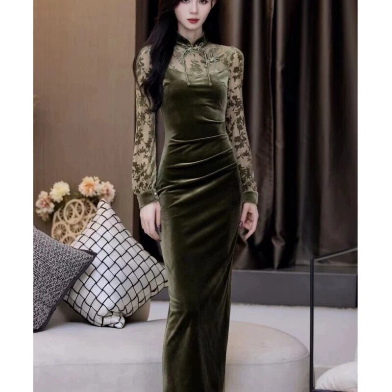 中国風のシックなユニークなスカートウエスト痩身気質レースステッチベルベットレトロ改良されたチャイナドレス yingd41920156727