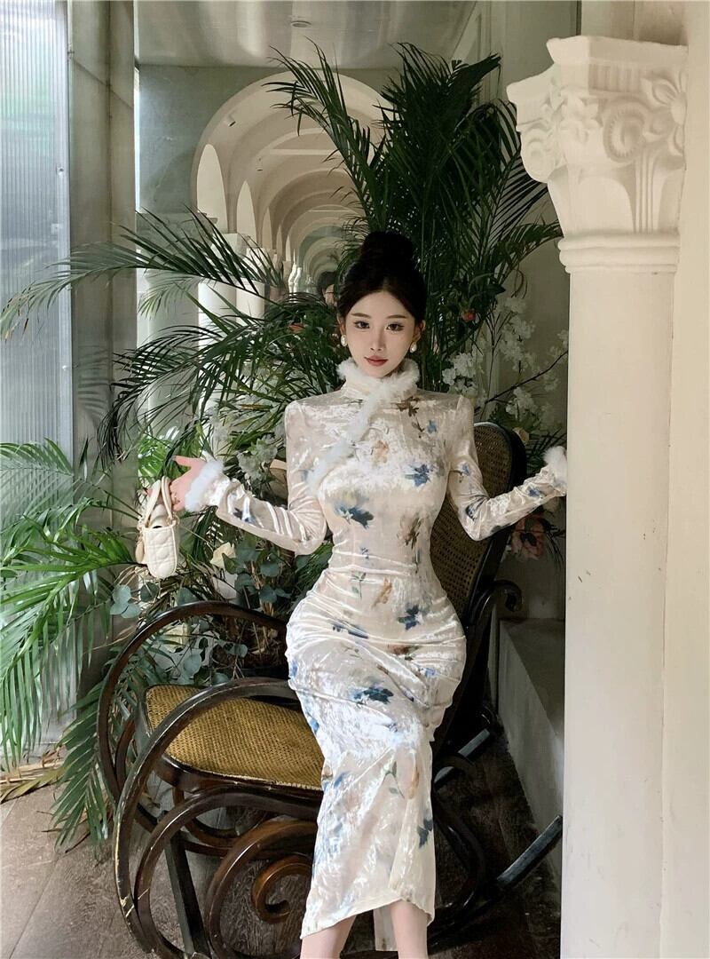 中国風の女性の秋冬スタイルのレトロなベルベットプリントのスリムなヒップカバーロングスカート、ハイエンドの改良されたチャイナドレス オータム 秋物 ウィンター 冬物 スリムヒップ yingd80649331497