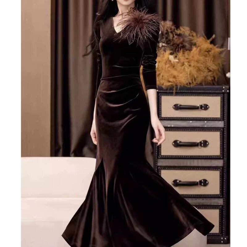 -冷たい、ロイヤルシスタースタイルのウエストを細くし、スリムで気質のある社交界のヒップハグフィッシュテールベルベットドレスレディース、2023年秋冬の新しいスタイル オータム 秋物 ウィンター 冬物 yingd71797910997