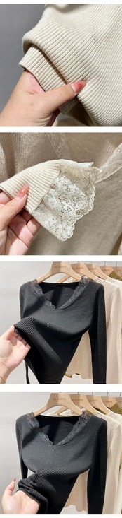 長袖 V ネックボトシャツ 2024 新しい女性の秋と冬のファッショナブルなファッショナブルなレースステッチセータートップス女性 ロング オータム 秋物 ウィンター 冬物 Vネック yingd93326303597