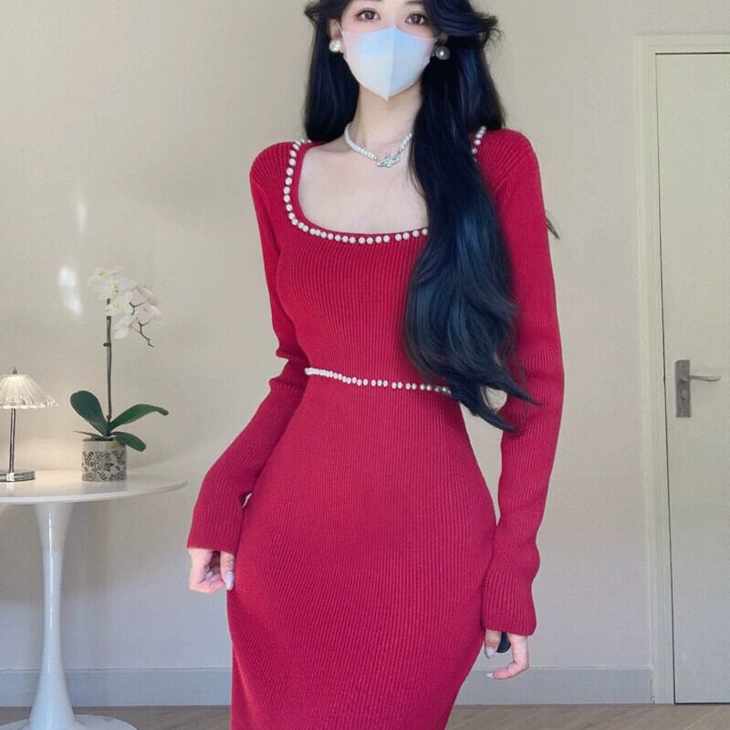 膝上の長いセータースカートとその下にコート、女性の秋と冬のウエストを細くする長袖スクエアネックボトミングニットドレス ロング オータム 秋物 ウィンター 冬物 スクウェア yingd26539686714