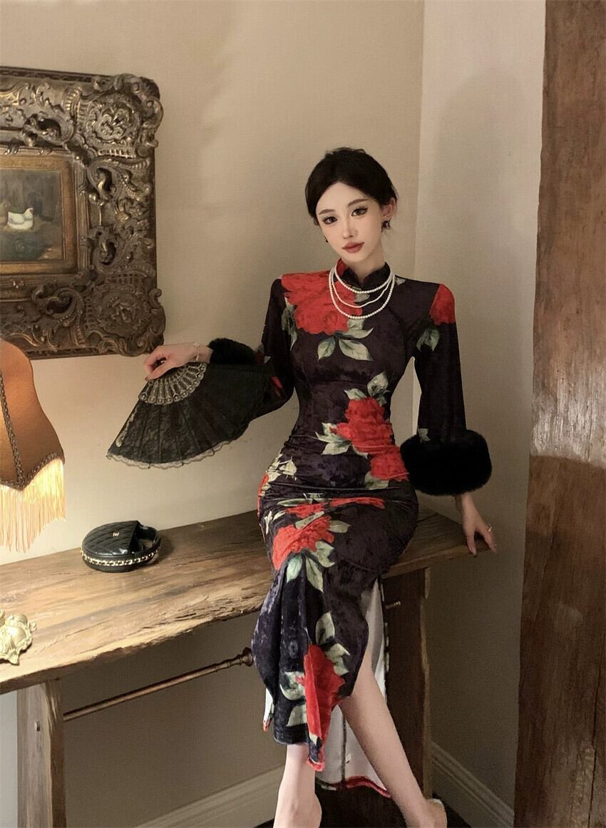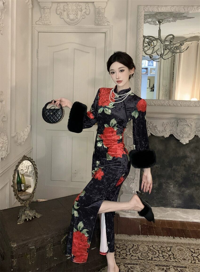 中国風の女性の秋と冬のベルベットプリント改良チャイナドレスロングスカートスリムヒップカバー冬のインナードレス女性 オータム 秋物 ウィンター 冬物 yingd14790085270