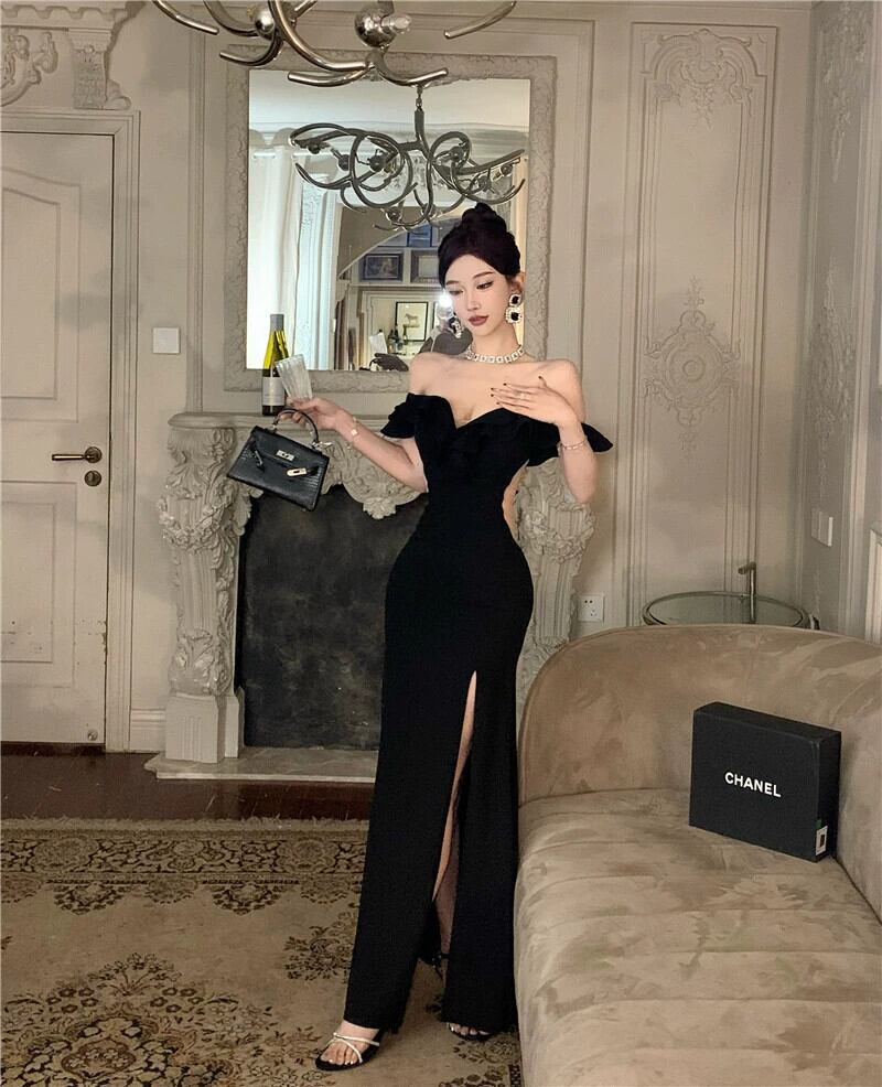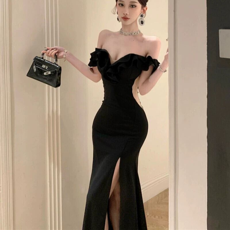 クールなロイヤルシスタースタイル、スリムフィットヒップハグスリットロングドレス、セクシーなローカットワンショルダードレス、気質のあるスーパープリティドレスレディース yingd58751059526