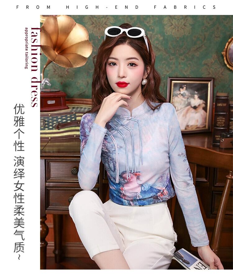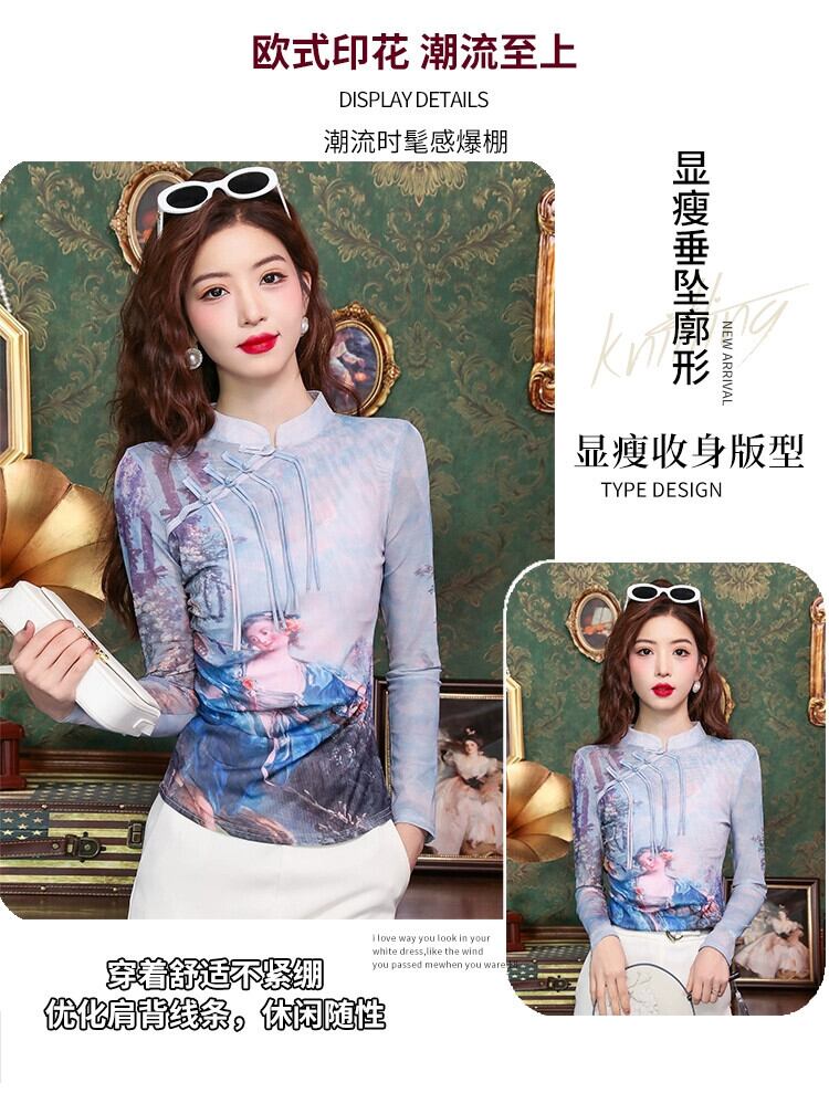 中国風婦人服 2024 春ハイエンドスリムフィット長袖レトロ国民風ディスクボタンプリントメッシュトップ ロング スプリング 春物 yingd55455751477