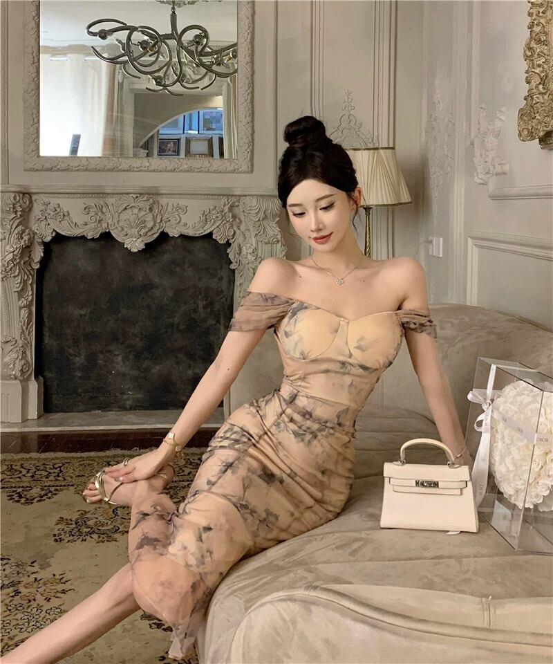 2024 春夏の新スタイルハイコールドロイヤルシスタースタイル花柄セクシーなワンショルダーチューブトップ気質スリムヒップカバードレス スプリング 春物 サマー 夏物 yingd22427076167