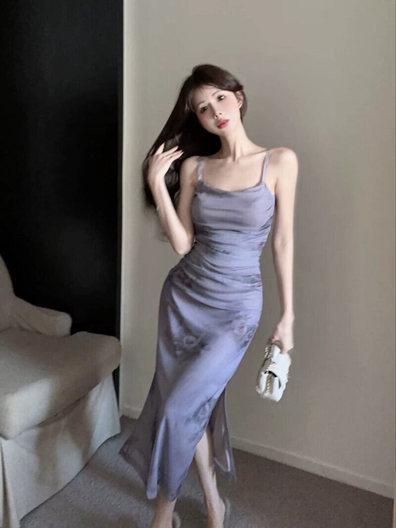 魅力的なスカート夏の女性 2024 新しいウエスト痩身フレンチプリントサスペンダードレス女性 サマー 夏物 yingd86785045504