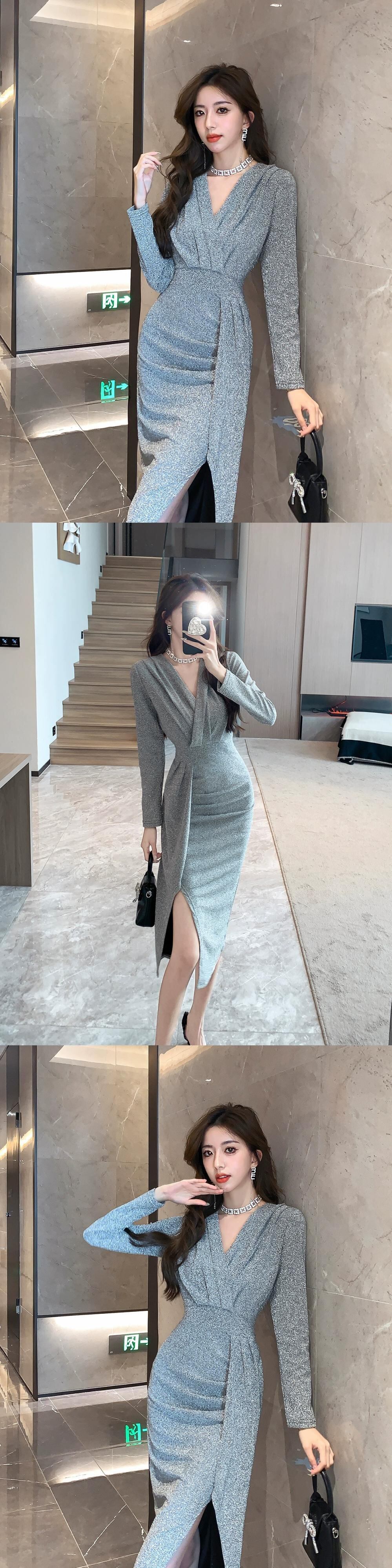シックでユニークで美しい小さなスカート、ハイエンドのウエスト痩身とエレガントな女性のセクシーなVネック明るいシルクドレスの女性の秋 オータム 秋物 yingd40659843282