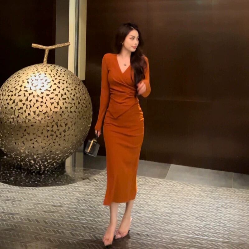 秋と冬のフランスのロングスカート、高級服の小さな人、スリムなウエストとスリムな気質、Vネックの成熟したシスタードレスの女性 オータム 秋物 ウィンター 冬物 yingd72050054324