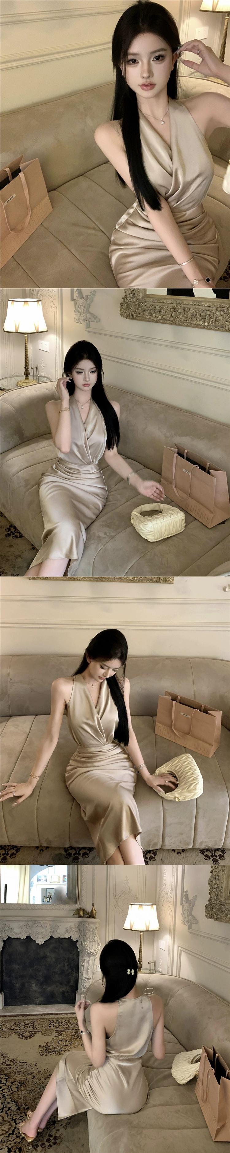 Yujie ライト成熟したスタイルのハイエンドのサテンの気質女神スタイルのハイエンドの絶妙な V ネックドレス 2024 新しい女性の夏の サマー 夏物 Vネック yingd66175685696