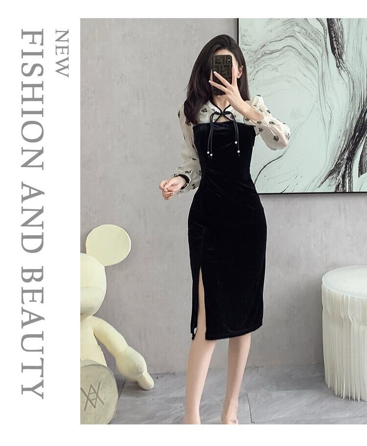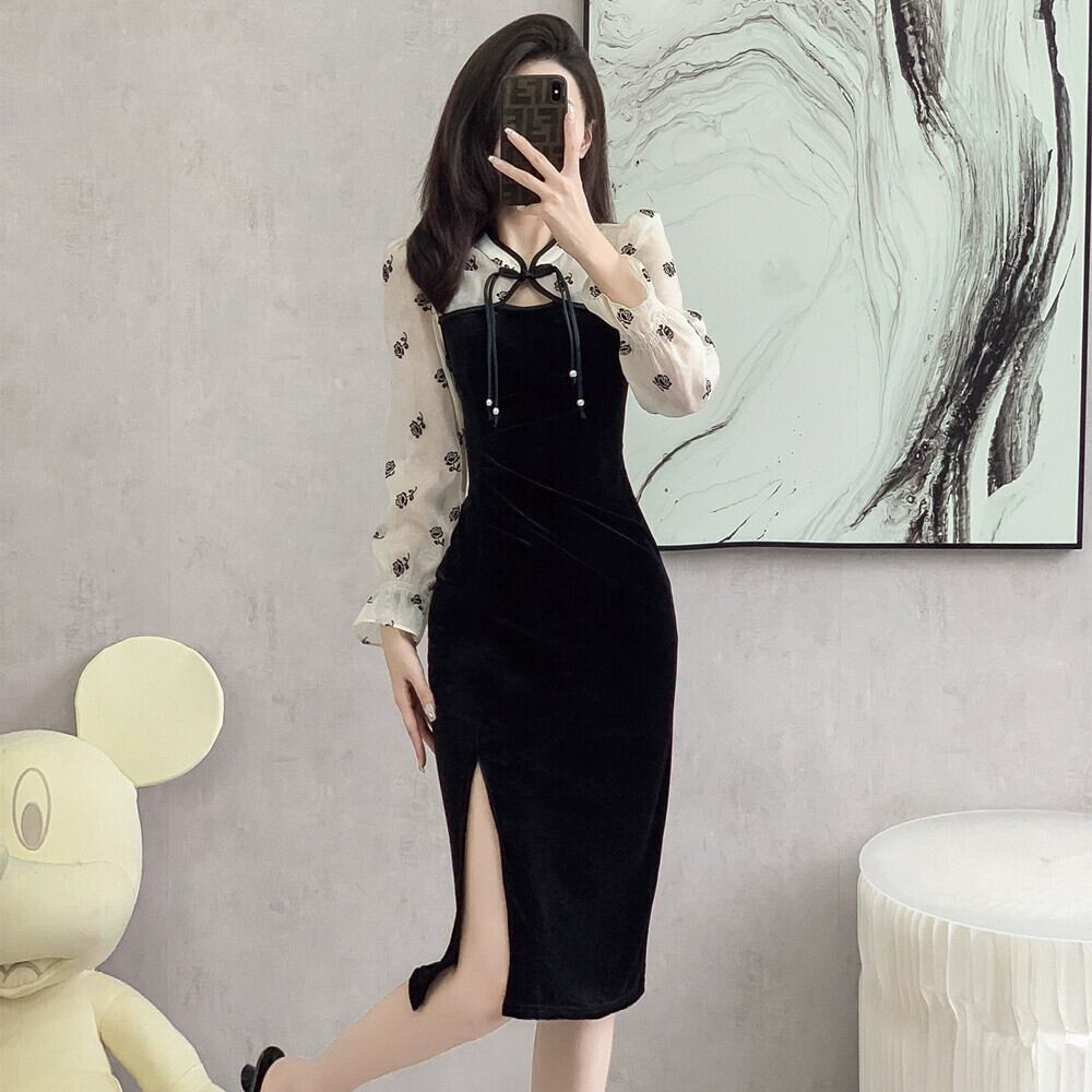 中国風の婦人服秋2024新しいスリムフィットヒップハグスリットレトロベルベット国民風ディスクボタンドレス オータム 秋物 yingd97287817348