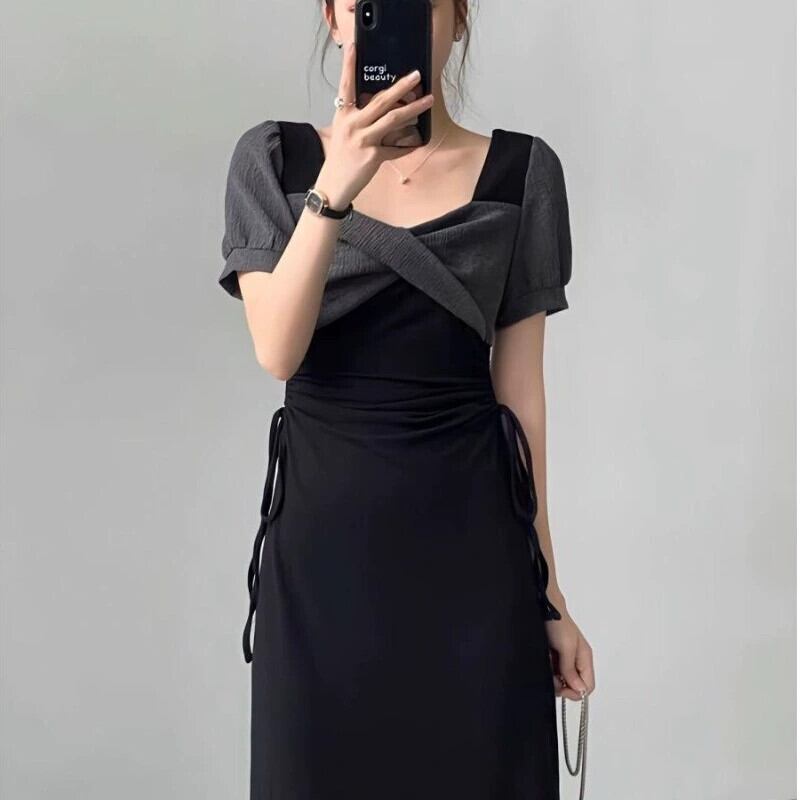 シックで甘いスカート、ウエストを細くする、スタイリッシュなデザイン、夏のコントラストカラーのスリットスクエアネックドレスの女性 大人ガーリー スウィート キュート カジュアル サマー 夏物 スクウェア yingd85085587115