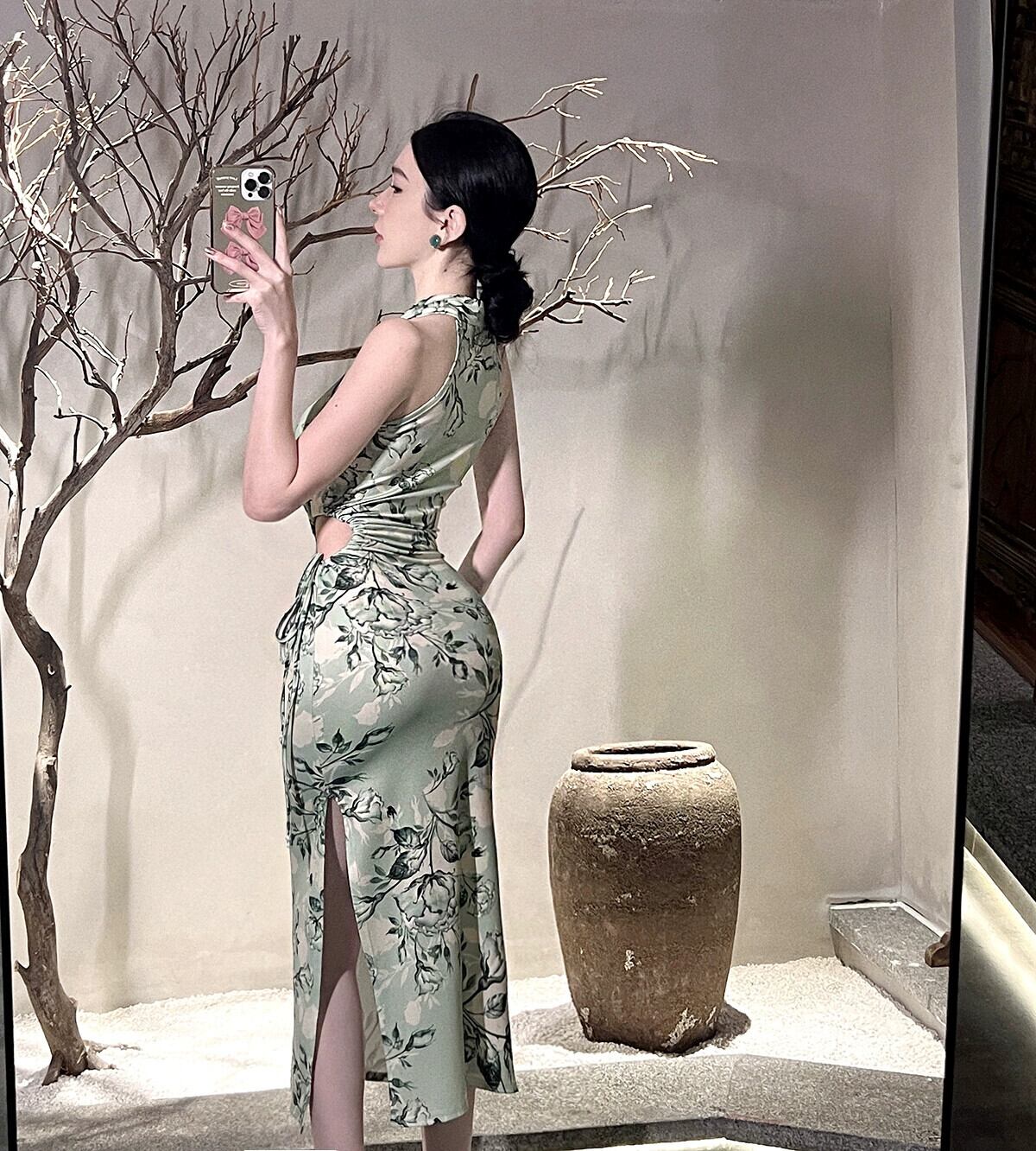 チャイナドレス若いハイエンドエレガントな女性のタイトフィットヒップハグ中空巾着セクシーなスリットプリントチャイナドレス yingd18148516823
