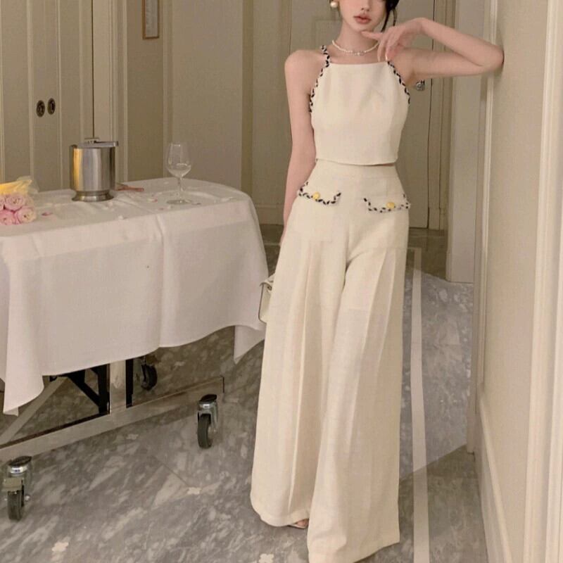 夏服には、ファッショナブルで年齢を軽減するサスペンダー トップス、ワイドレッグ パンツ、クールな女性の高級スーツの完全なセットが組み合わされています。 レッド サマー 夏物 yingd55754895674