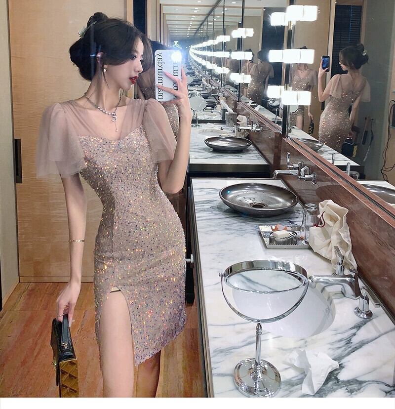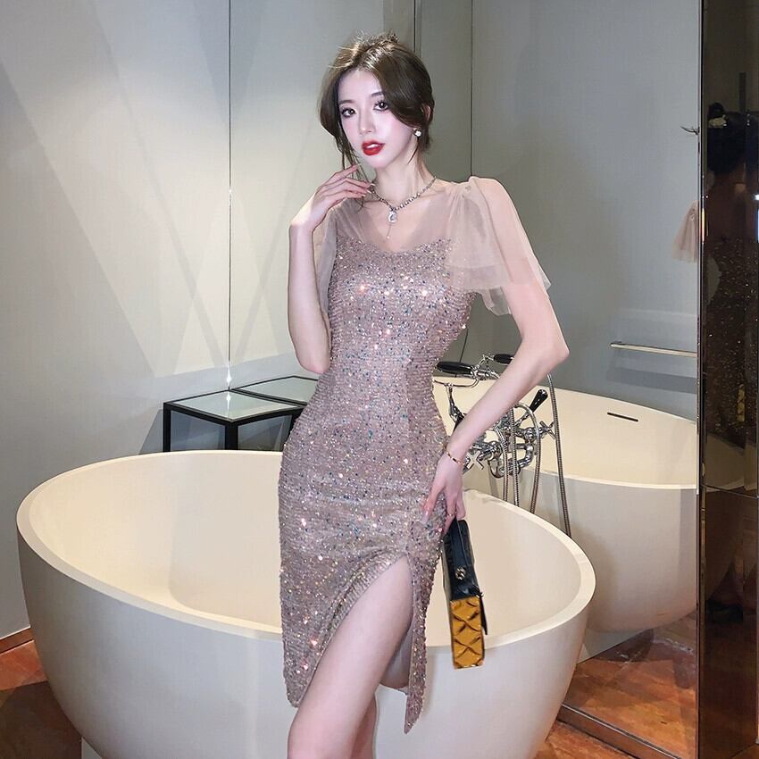-軽い高級感のある婦人服、社交界の優傑の軽くて洗練されたスタイルのスリムフィットヒップハグスパンコールスリットドレス2024新しいスタイル yingd29361978741