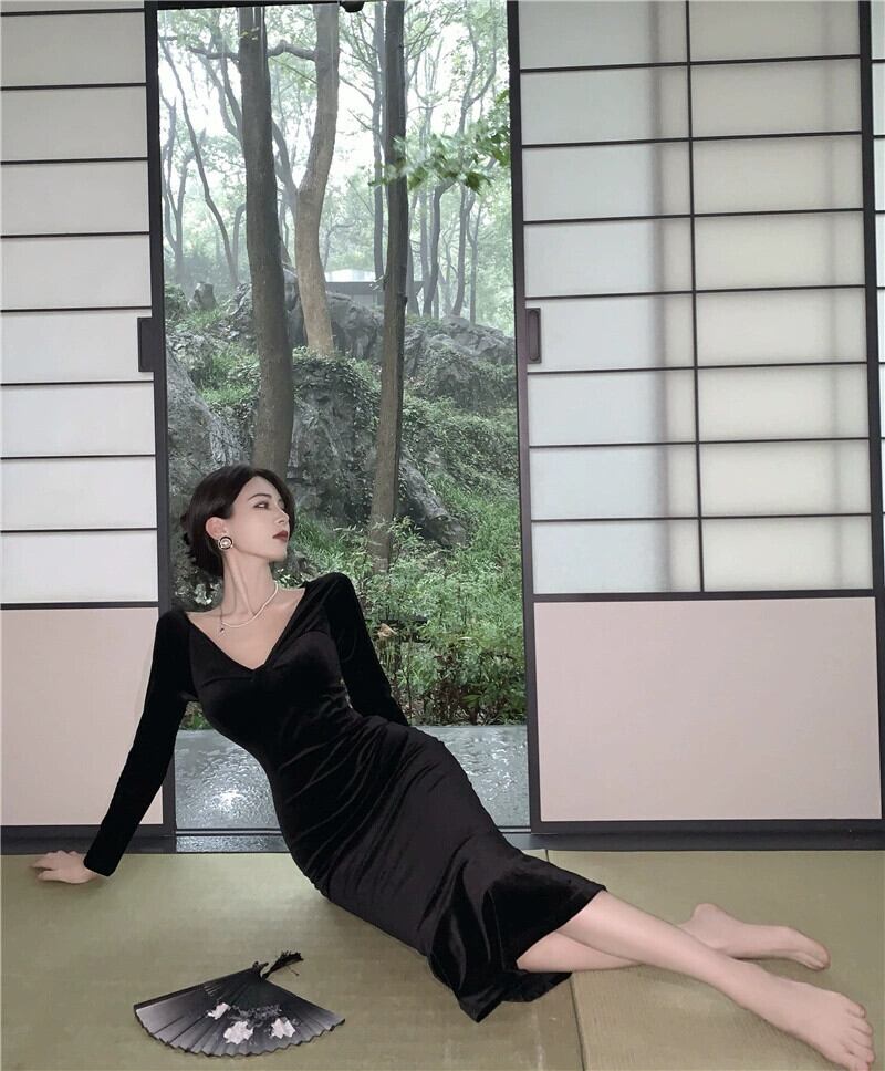 秋の摩耗ハイエンドウエスト痩身エレガントセレブハイエンド絶妙なヒップハグフィッシュテールレトロベルベットドレス オータム 秋物 yingd71302973867