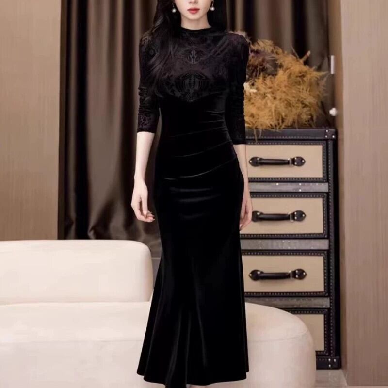 -エンド婦人服、軽くて豪華な気質、社交界のスリムフィットヒップハグロングスカート、高級で超見栄えの良いベルベットドレスの女性秋冬 オータム 秋物 ウィンター 冬物 yingd16859959179