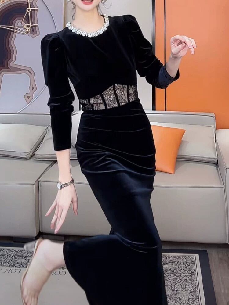 Bubu Shenglian フィッシュテールスカート秋冬レーススプライスベルベットスリムフィットヒップカバーロングスカートエンドと超美しいドレス オータム 秋物 ウィンター 冬物 yingd10263174858