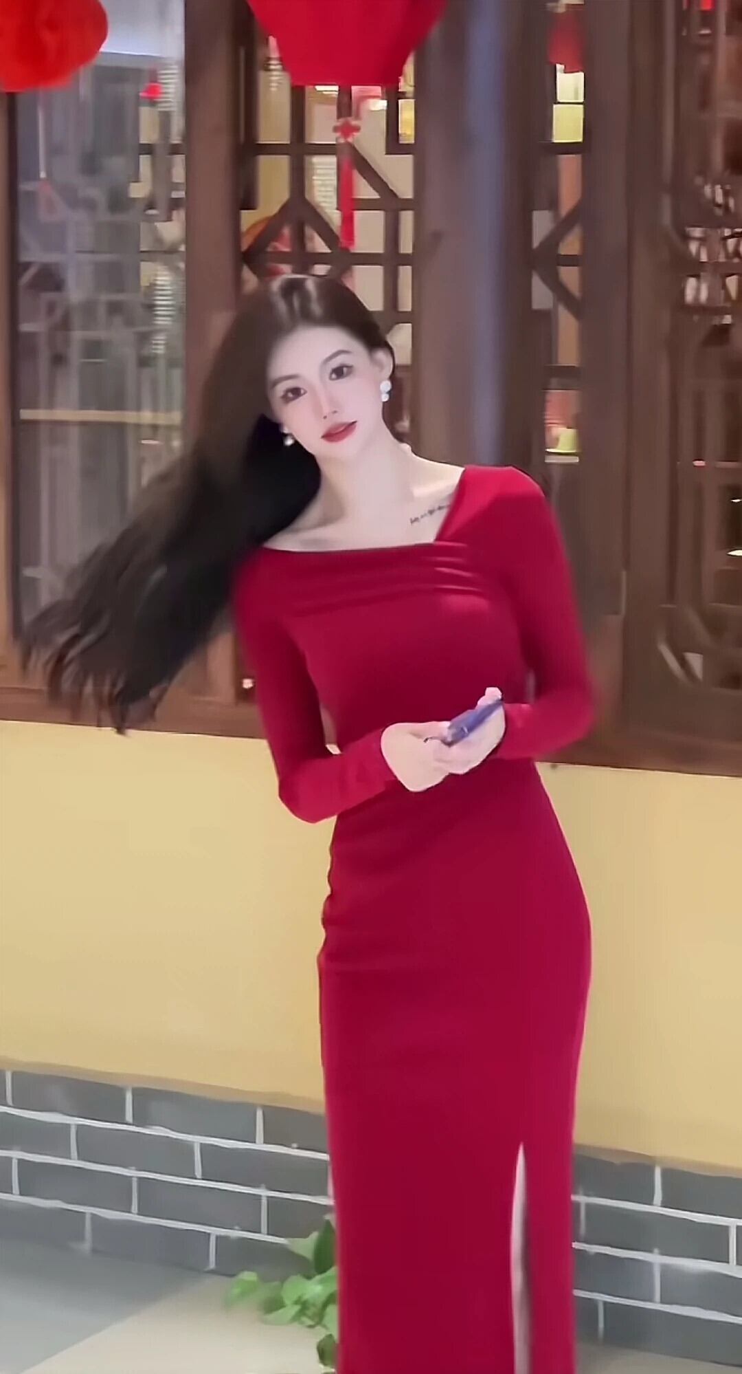 -エンドスリムフィット、スリムフィット、エレガントな長袖斜め肩のユニークな小さなドレス、クールなロイヤルシスタースタイル、超かわいい ロング レッド yingd95085613